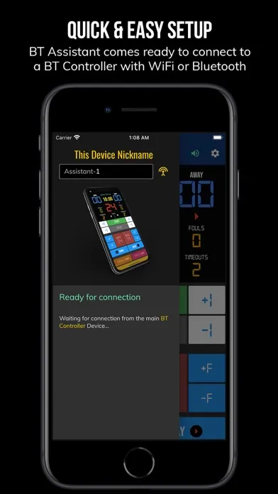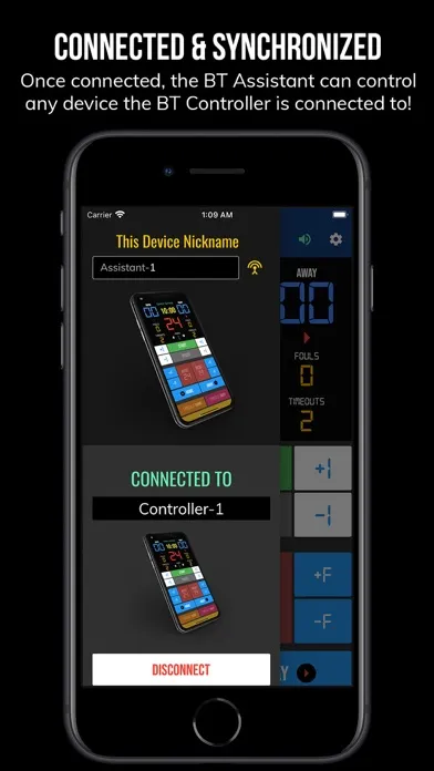 BT Assistants are add-on controllers that synchronize with the main BT Controller. Assistants can help control scoreboard and clock devices in addition to the main user using the BT Controller. To use, connect to the BT Assistant using the BT Controller app, then you're ready to go! The BT Controller may connect to as many BT Assistants as needed, allowing a full team of users to help control the Scoreboard and Shotclocks simultaneously during a basketball game or practice.