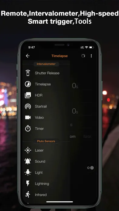 Pluto Trigger(Bluetooth hardware device, purchase separately) is a high-speed and smart camera trigger. It is controlled by smartphone app over Bluetooth, and features remote shooting, timelapse, HDR, video recording, lightning photography, sound/light/laser high-speed trigger, infrared camera trap, smile/motion/vibration smart trigger, droplet collision photography and more, totally 24 modes.