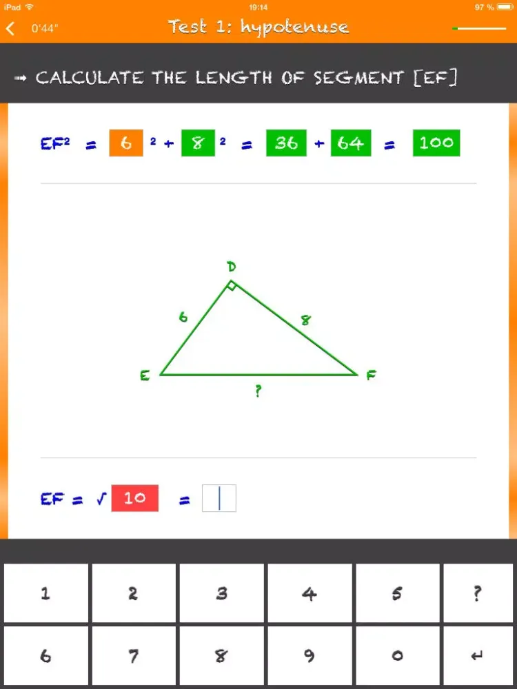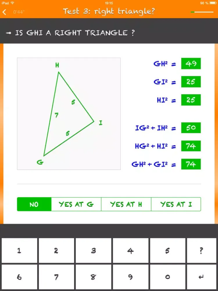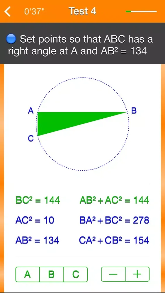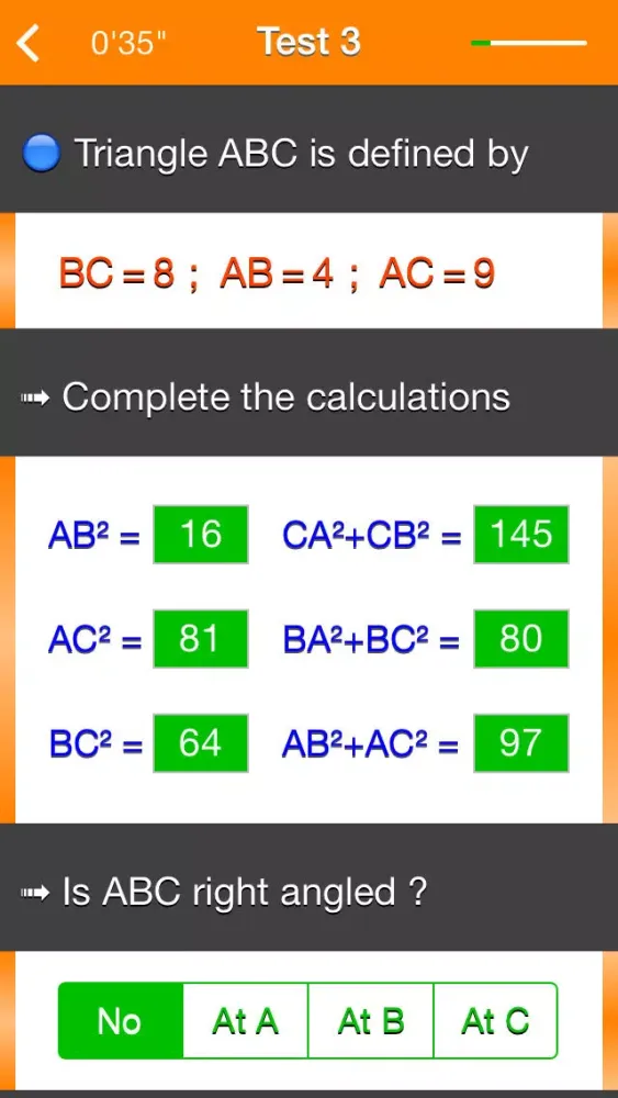 The second part - I TEST MYSELF! - shows 4 exercises that deal with the theorem and its converse, by applying these on many cases (how to calculate of the hypotenuse of a right angled triangle, a given triangle is-it right angled, which formula to calculate the length of any right angled triangle side, how to locate the points to obtain a given right angled triangle).