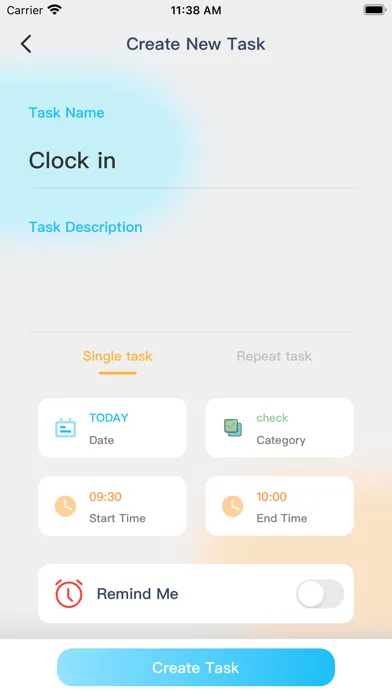 Set reminders for task start times, sync and restore data, switch themes, create new categories, community exchanges and feedback, and more.