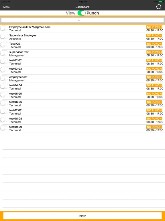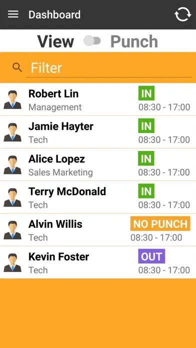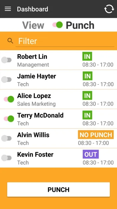 A supervisor can use the App to clocking in and out for the employees at their assigned workplace(s), as well as viewing their time sheet and punch status in the dashboard.