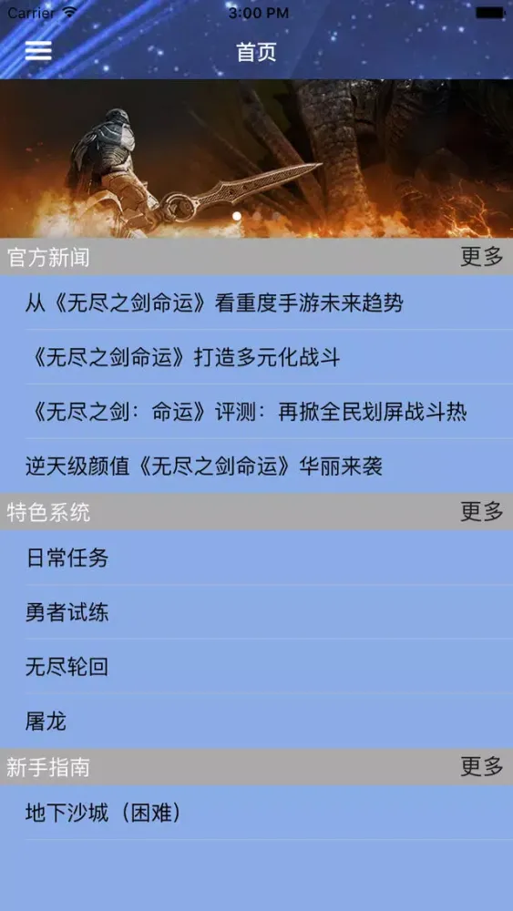 《无尽之剑命运》是一款由腾讯游戏研发运营的3D史诗奇幻动作游戏大作。纯正浓郁的欧美风,磅礴宏大的剧情,流畅华丽的战斗体验和手感操作是本作的特点。在继承《无尽之剑》三部曲的基础上,丰富的装备收集与宝石合成,充满特色的天赋成长体系,各种武器连招和魔法运用,让玩家尽情体验战斗中的无尽变化和超爽打击感!本攻略通过官方新闻来了解每一个活动,介绍了游戏的特色系统,更有新手指南和攻略技巧来提升战斗力,还有各种视频来满足玩家的观感。