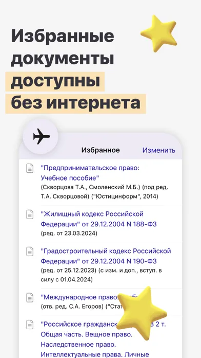 На любой документ или его часть можно поставить закладку. Документы с закладками сохраняются в разделе «Избранное». Они доступны без интернета, так что нужный кодекс, закон или учебник всегда будет под рукой.