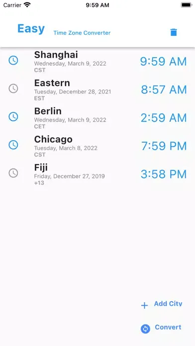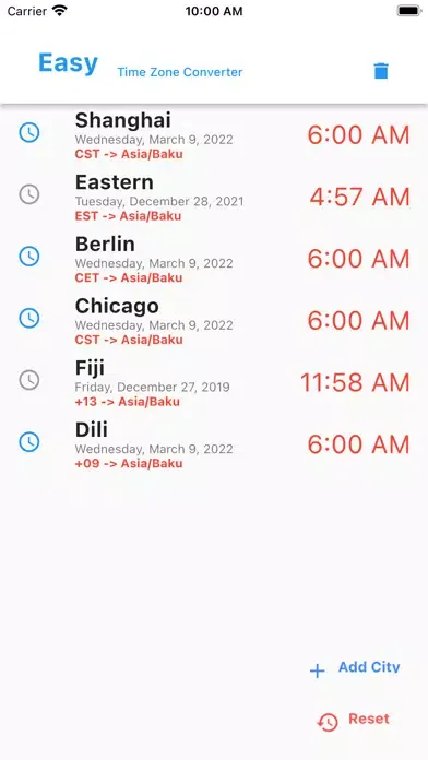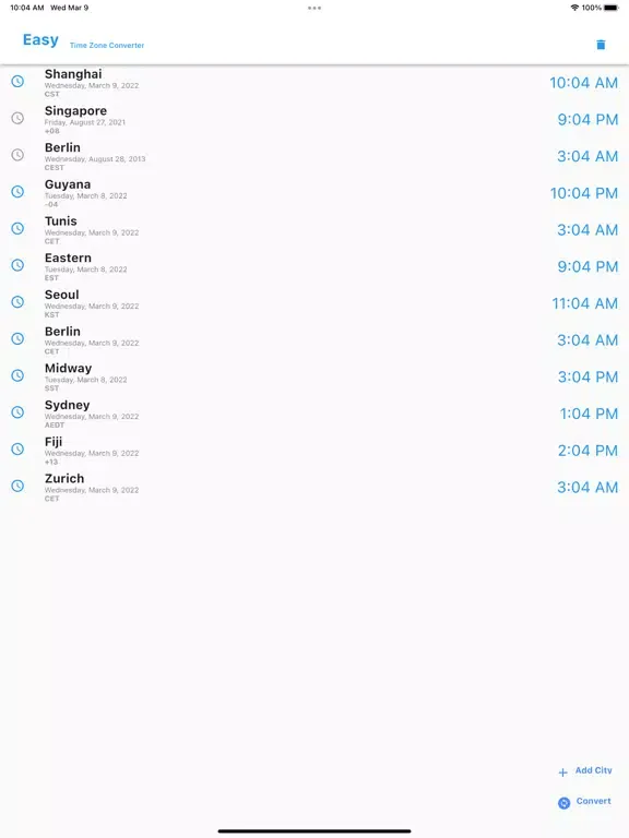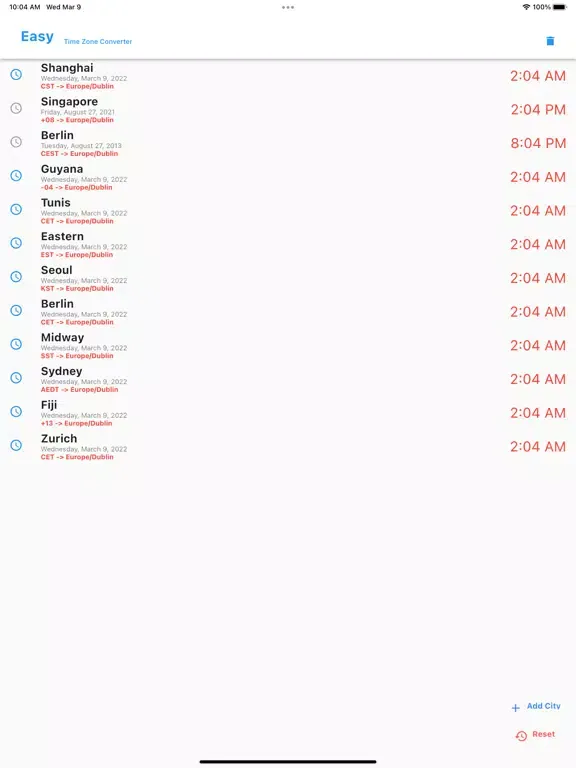 Easy Time zone converter is a time zone converter. It can help people who need time converting service. Add your original city and time, press converting button and select your target city, you will figure out the time issue! Easy and simple!