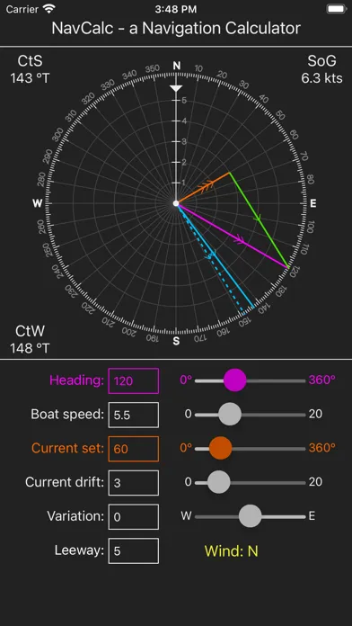 NavCalc will dynamically update the drawing as you change any of the parameters (heading, boat speed, current set or drift, variation).