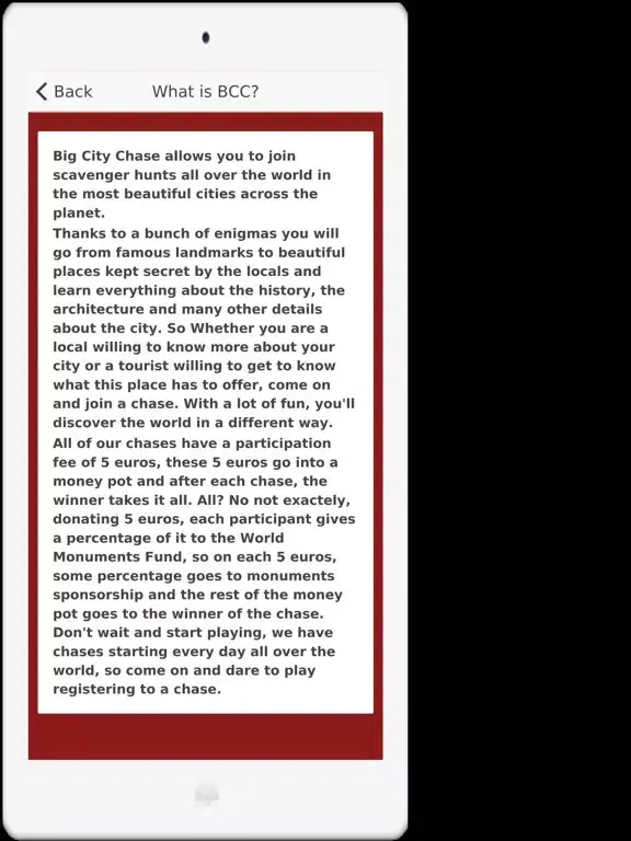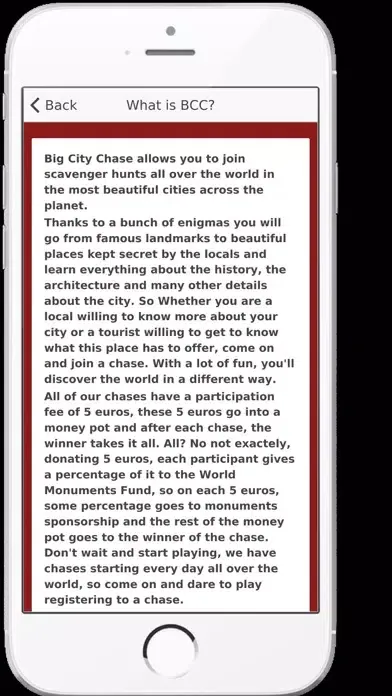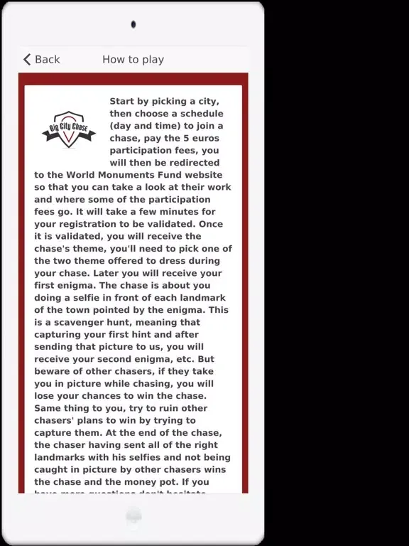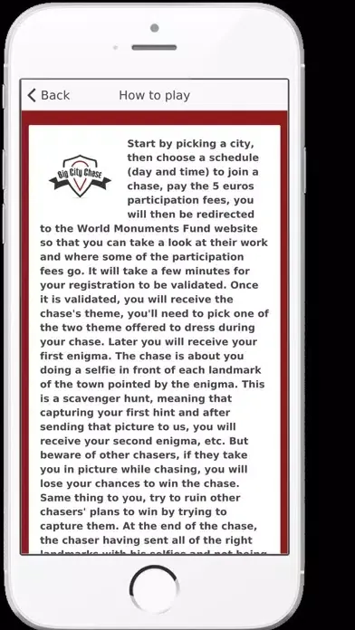 Through the app you will receive enigmas to solve, enigmas point at some landmarks in the city, your job is to take a selfie in front of those indicated landmarks, try to get all landmarks before time runs out and try to do so without being chased down yourself by other chasers that could ruin your chase just by taking you in picture!