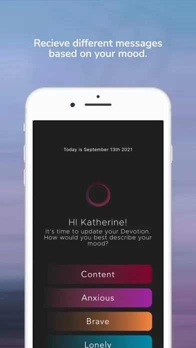 Devotion asks for your pronouns as a way to create more intentional affirmations. You can then switch between four moods (Brave, Content, Anxious, or Lonely) at any time to customize the tone of the messages you receive.