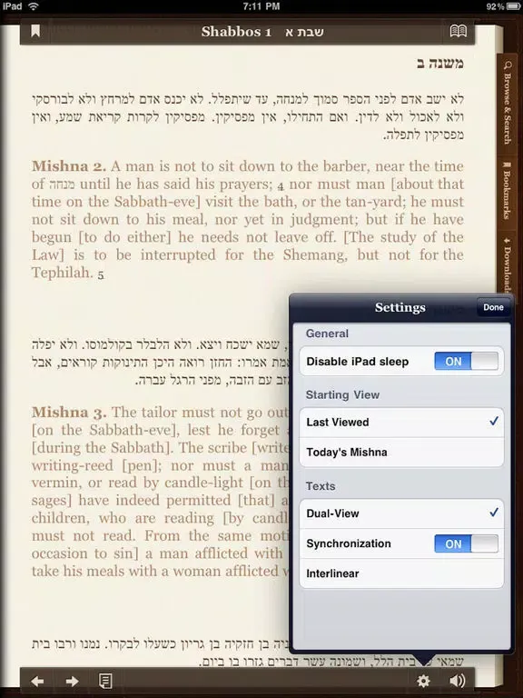 iMishna takes advantage of the iPad display and offers stunning high-definition graphics and interfaces to make learning the Mishna an even more pleasurable experience in both portrait and landscape modes.