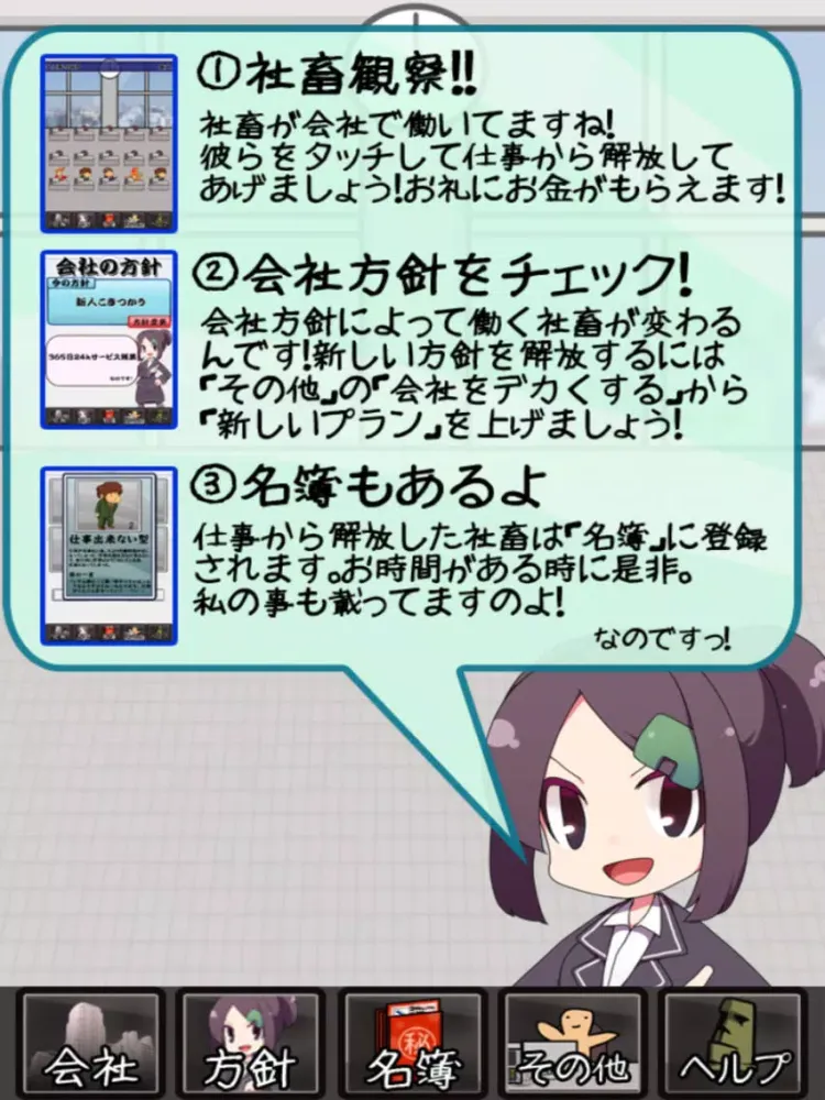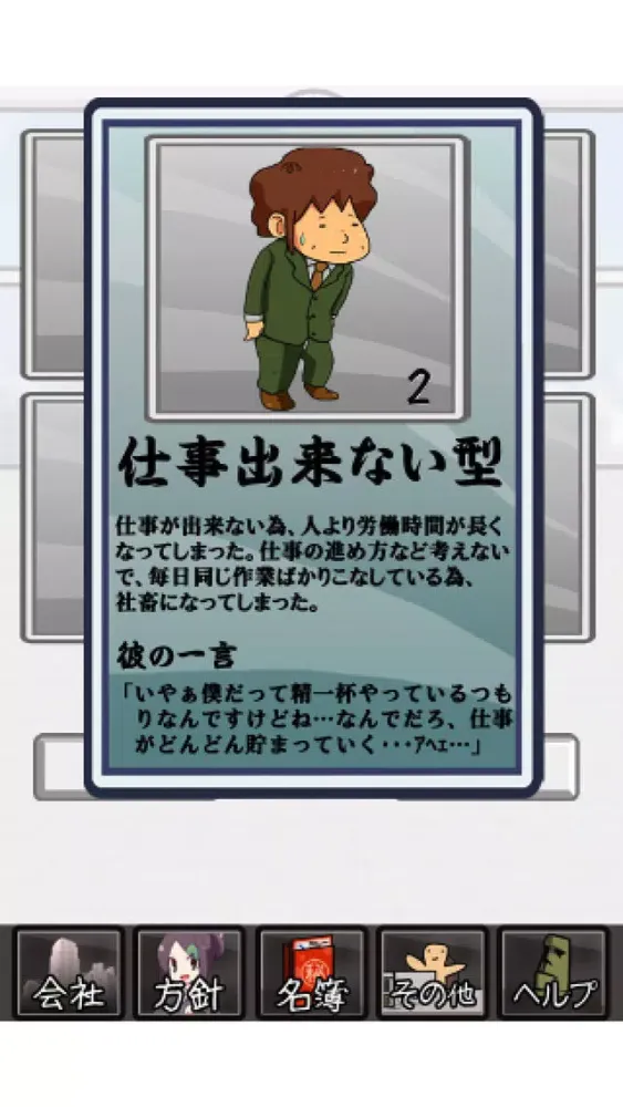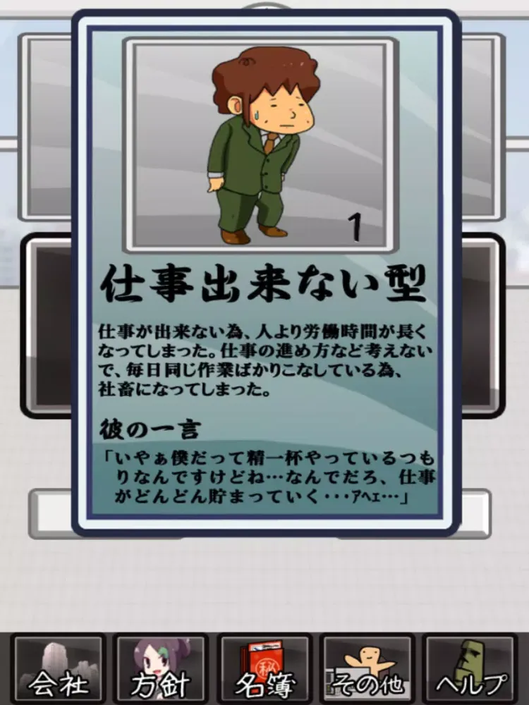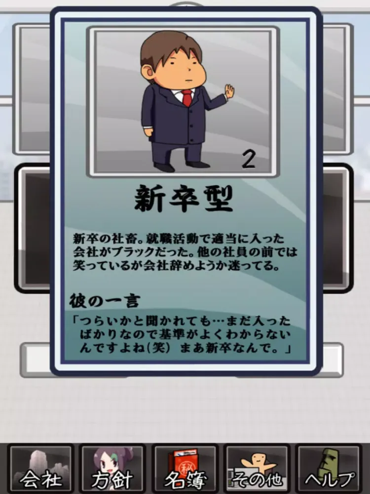 テーマとして社畜というあまり響きの良くない言葉を選んでおりますが、このゲームではどこの会社にもあてはまる社員のタイプが登場します。