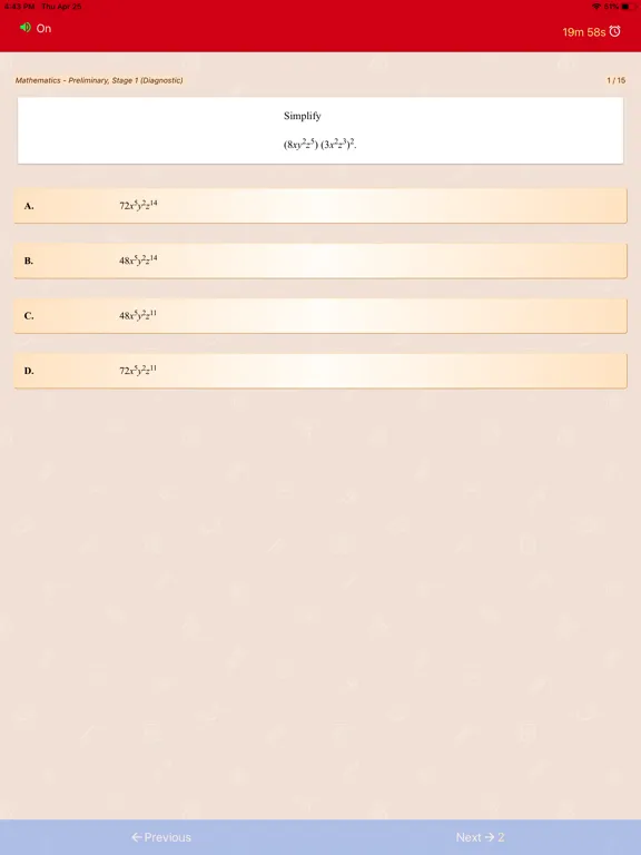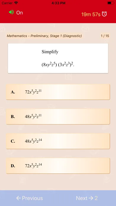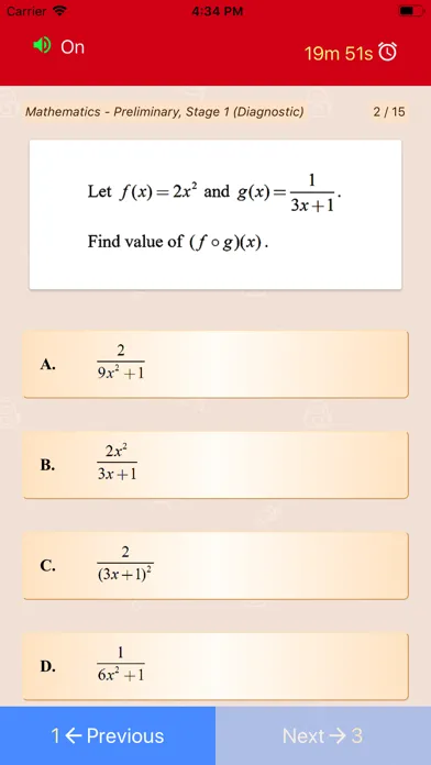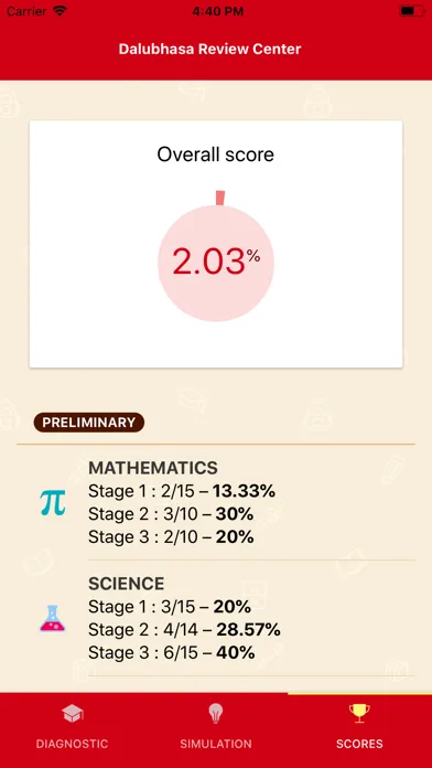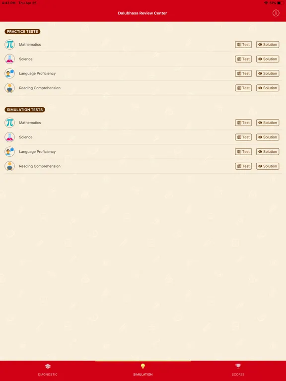 The app is divided into 3 major parts (Diagnostic, Practice and Simulation) with 4 subtopics (Mathematics, Science, Language Proficiency and Reading Comprehension) in each part.