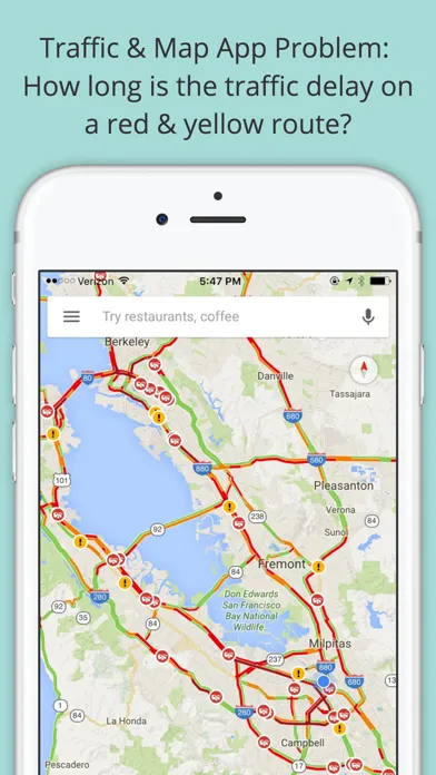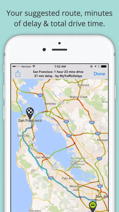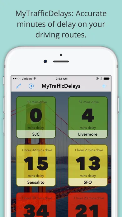 * Every time you open MyTrafficDelays, you get up an up to the minute best route available from your origin to destination (or current location). Just tap on any of the colored boxes and you'll see the route on a Google Map. The routes (and traffic) are provided by Google Maps. We provided a simpler way to view exact delays in minutes.