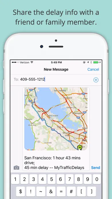 * Share the route delay, the route map with traffic, and total drive time via messaging, email, Twitter or Facebook.