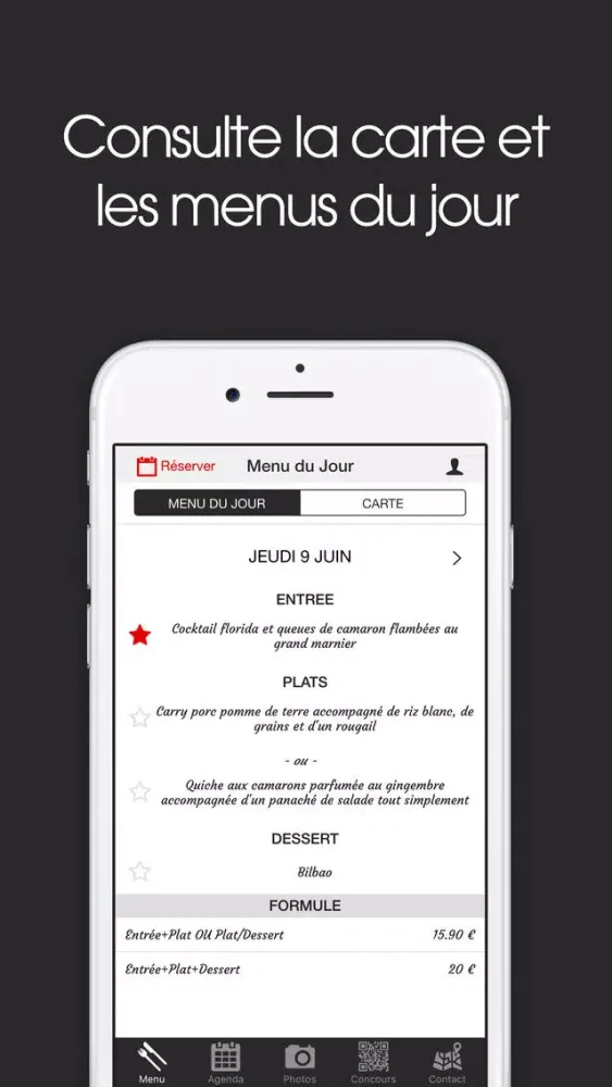 - Menu : consultez les menus du jour et la carte du restaurant.