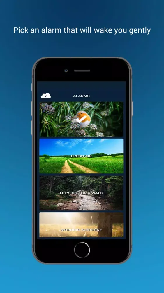nApp will wake you in a gentle way by starting out very quiet. Every 10 seconds, the alarm sound gets louder until you wake up.