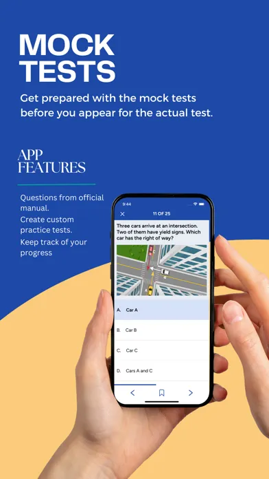 The app includes a practice module that allows to get familiar with questions that fall under different categories like Traffic Rules, Road Signs and Rules of Safe driving. It also keeps track of the progress you have made in each category. It contains questions from following categories: