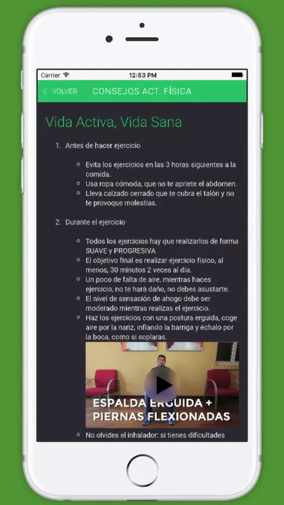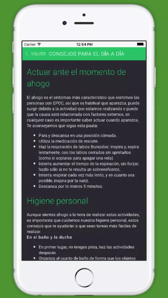 - Contenidos in-formativos, como: vídeos sobre cómo hacer ejercicios o cómo se usan correctamente los inhaladores, menús adaptados a las características del/la usuario, estrategias para abandonar el consumo de tabaco, claves para identificar las descompensaciones y sabes cómo actuar, conocer la oxigenoterapia y también consejos para el día a día (subir escaleras, hacer la compra, higiene personal, etc.)