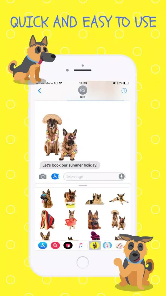 * 104 wonderfully curated German Shepherd emojis/stickers in six categories, making it easier to find the expression for your message