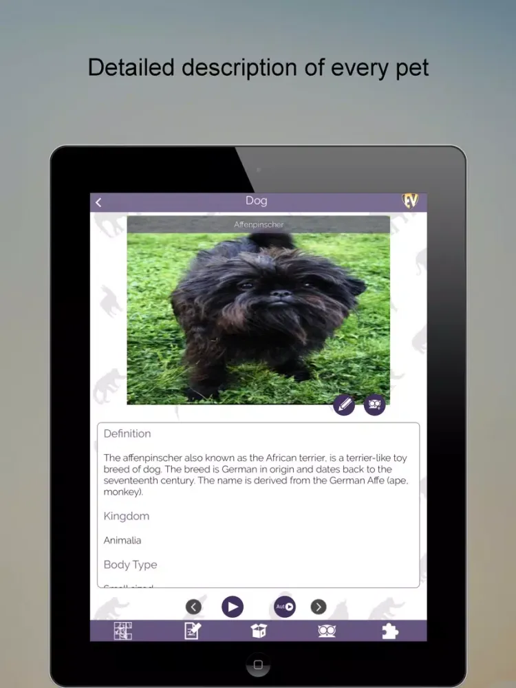 * Categories - Know the details about pets like Definition, Breed, Country, Group, Kingdom, Body type, Lifespan, Weight, Height and more.