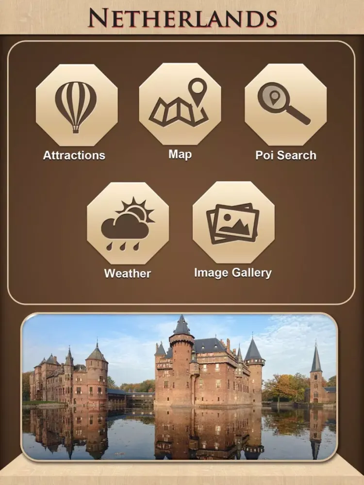 Netherlands Traveller's Choice App having Complete List of Attractions, Amazing photo gallery, pre populated POI search, Local search, Weather forecast for the next five days and GPS Enabled Map is Very handy when planning your vacation.