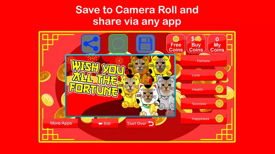 Just use the Camera in the iPhone or iPad to take photos, or get lovely photos with cute expressions from Camera Roll, add them to ‘5 Lucky Cats’, an unique cute video will be made.