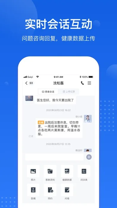 医务人员跟患者线上互动,可以在线发送健康数据以及问诊表、健康知识、在线预约等信息。
