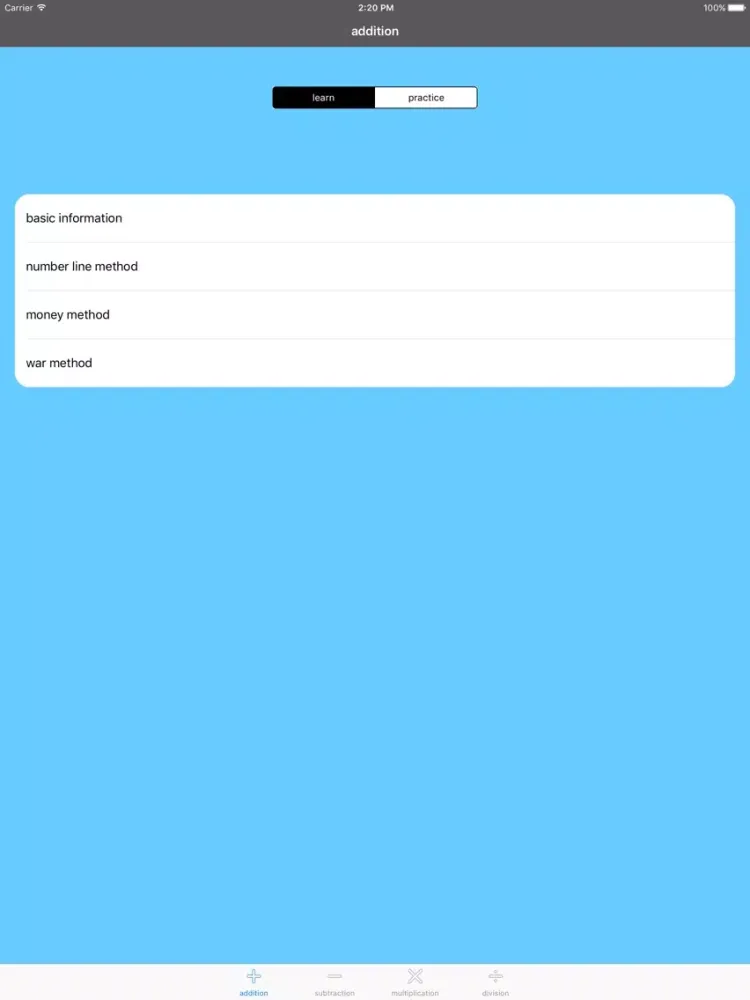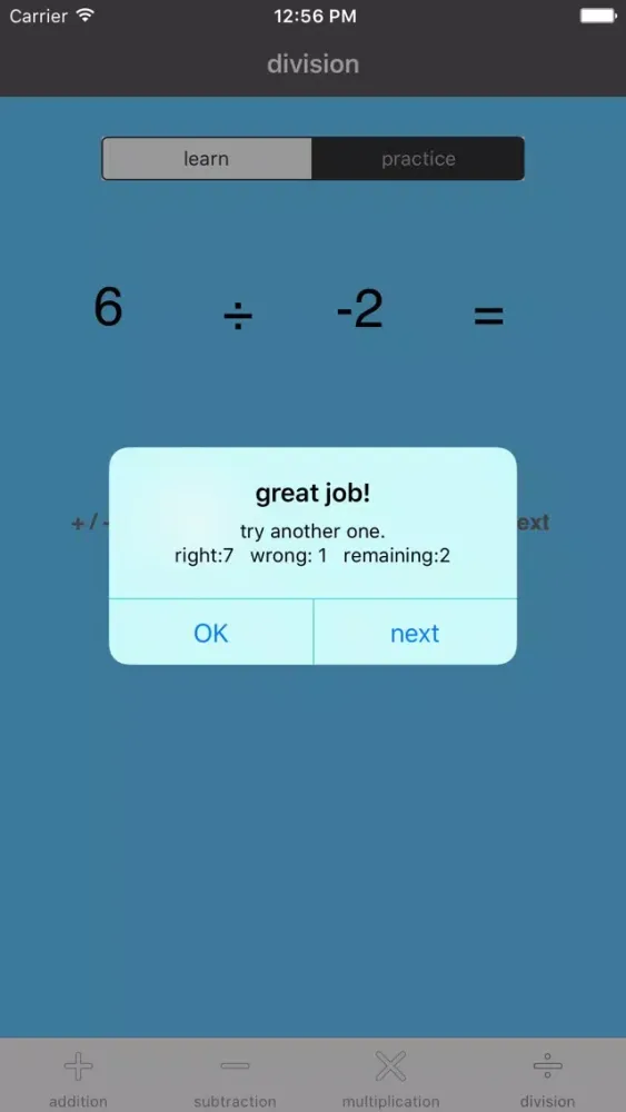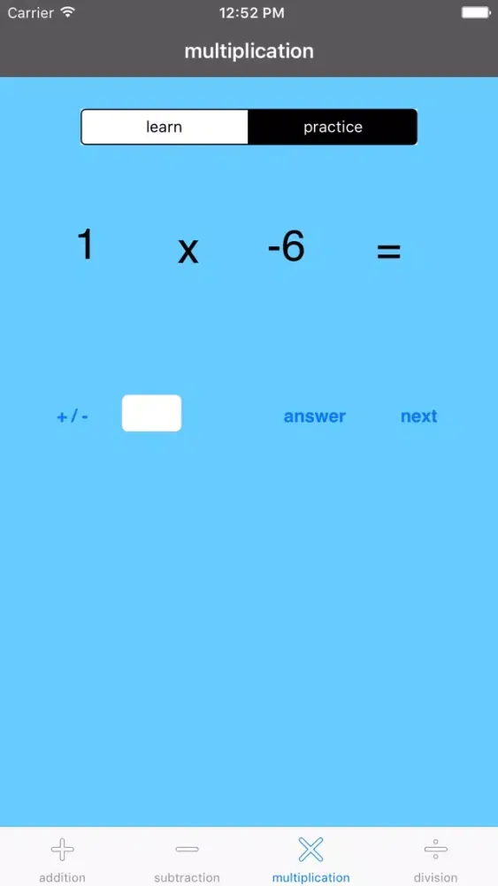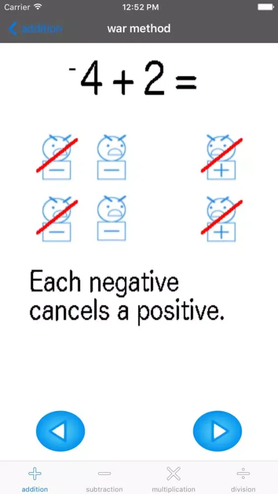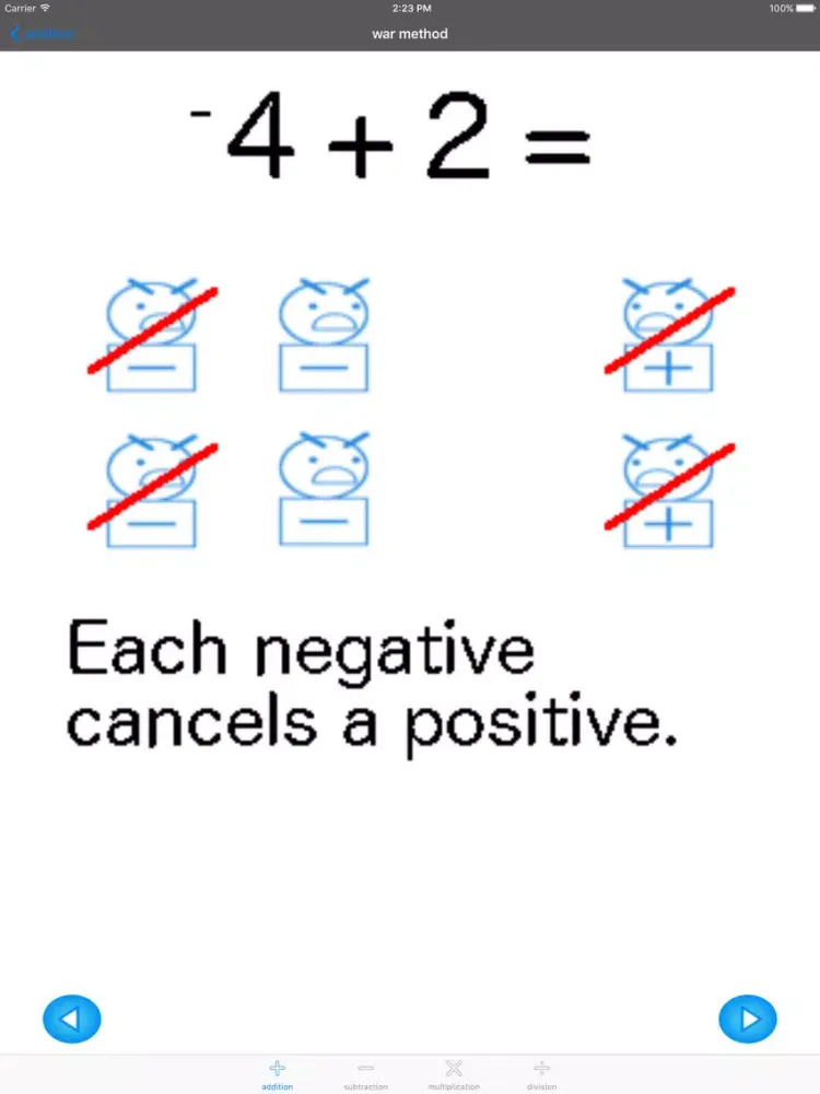 This app is for helping students learn how to work with negative numbers. Each operation has a section for learning and a section for practicing. Feedback on how the user does is also given in the practice section. Problems are randomized so that the user can practice on a large set of questions. Everything is designed so that the user can work at her or his own pace. Students can use it by themselves and, of course, it's even better with someone to guide them.
