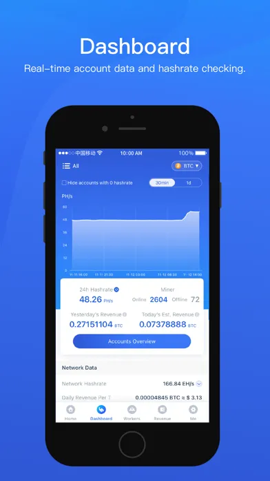 The f2pool app offers a simple way for everyone to manage their mining operation. Conveniently manage your mining machines, view your revenue, and even utilize our one-click button to switch between logged-in and anonymous mining. Miners can access every function of the website through the app, including the ability to set up custom alerts for any worker or group.