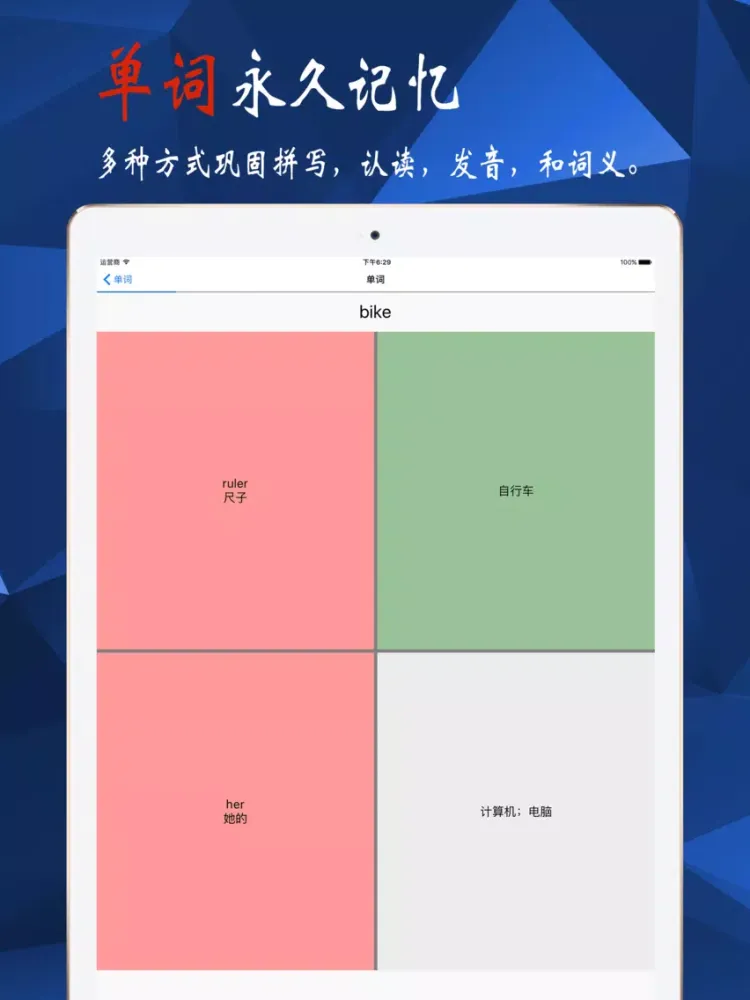 --单词:单元同步单词,8种练习模式,多种有效方式刺激大脑,成绩报表,运用记忆科技的智能复习。综合巩固单词的认读,发音,词义,拼写,实现单词用久记忆效果,在最短的时间内久记忆单词。