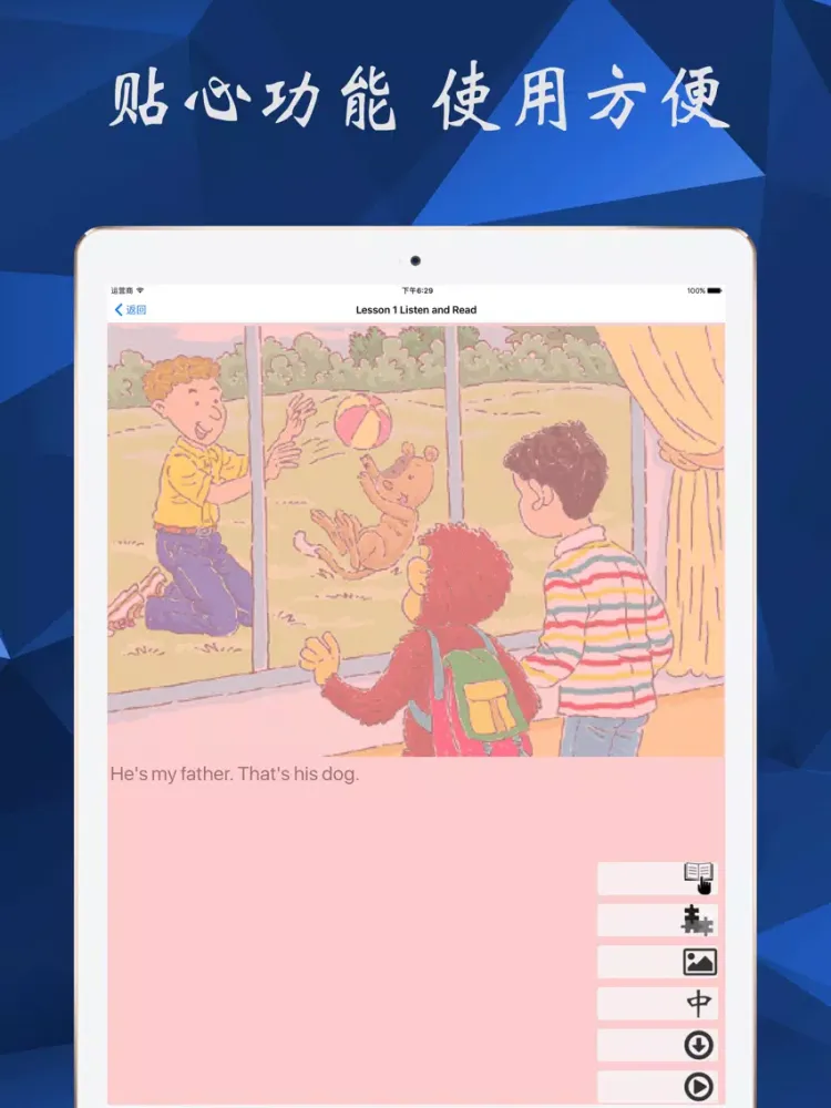 --课文: 有声图文阅读,纯正语音内容,帮助学生在会认单词的基础上,实现会说,会用,拓展阅读能力。