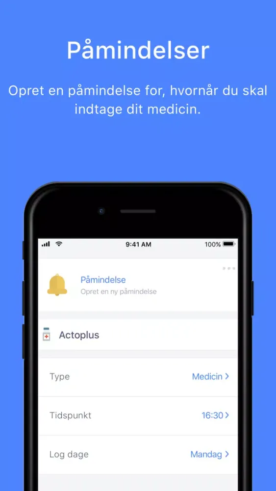 - Opsætning af reminders for insulin, medicin, blodsukkermåling, mm.