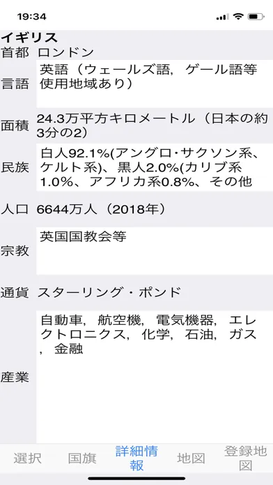 タッチした国の首都、言語、面積、民族、人口、宗教、通貨、産業が表示されます。