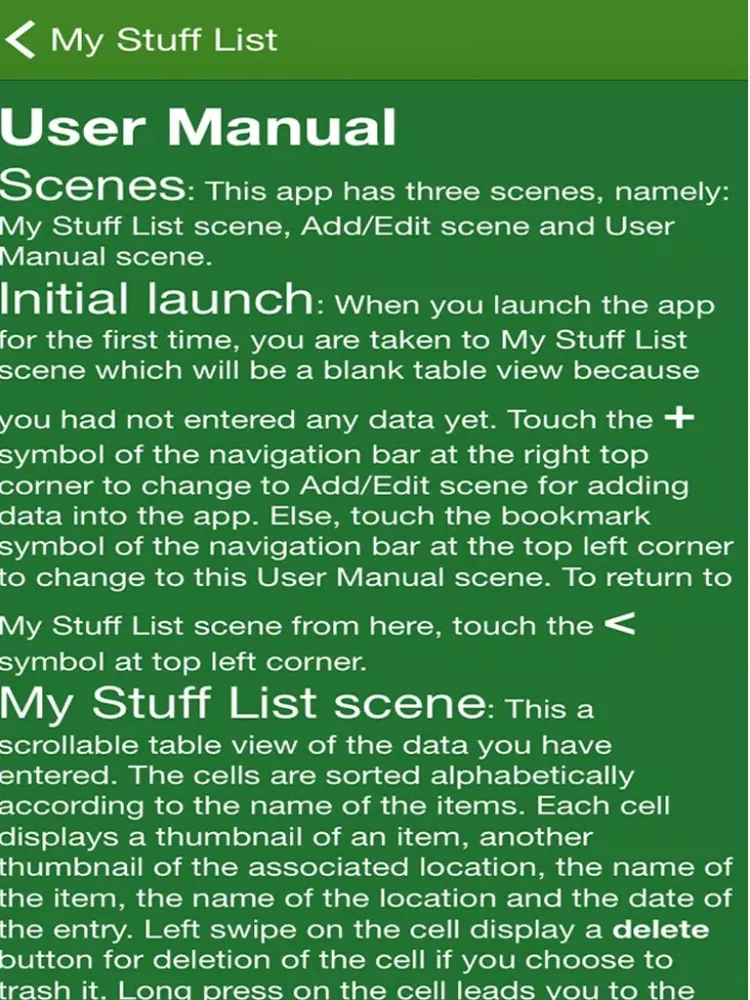 • User Manual: A user manual is included as one of the scene showing the user the details of the app such as navigation around the app, adding new item, editing or deleting data. It serves as a reference for the user.