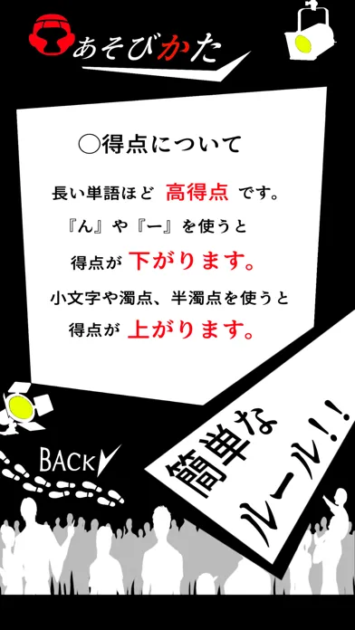 より長く、濁点、半濁点、小文字が使われている言葉が高得点です。