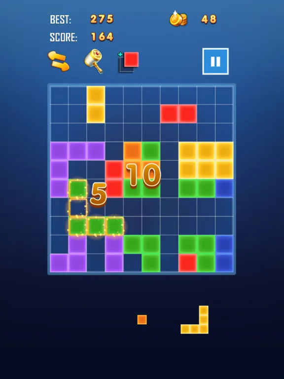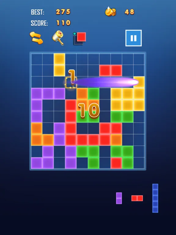 2. Drag mode: Drag the three candidate squares at the bottom of the screen into the square grid. One row or one column can be filled to eliminate them.
