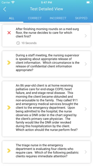 The NCLEX-RN exam is pass/fail. Therefore, you must adapt your preparation strategy accordingly. The exam does not depend upon a numerical score, so you must gain up to 95% confidence needed to be able to answer at least 50% of the exam question answers correctly. This app is here to help you identify the less to medium difficulty questions so you can not only pass the exam but also get the edge you need to stump all other candidates in performance.