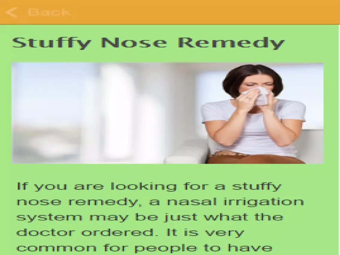 Home Remedies For A Stuffy Nose is an app that includes some helpful information on home remedies for a stuffy nose.