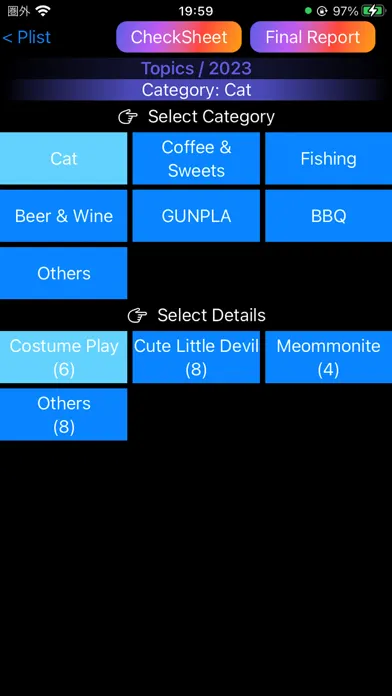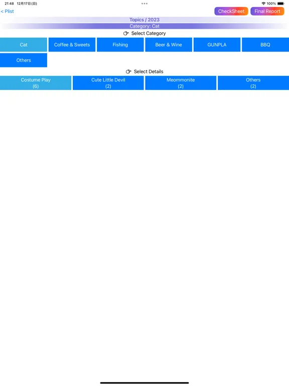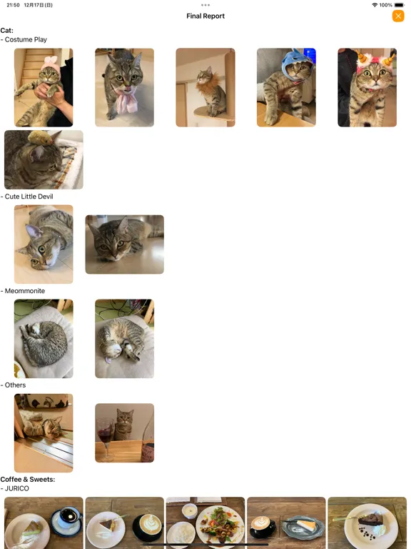 「Final Report」ボタンを押すと、最終的にカテゴライズされた全ての写真を、それぞれに対応するカテゴリ・詳細情報のテキストラベル付きで一括表示することができます。