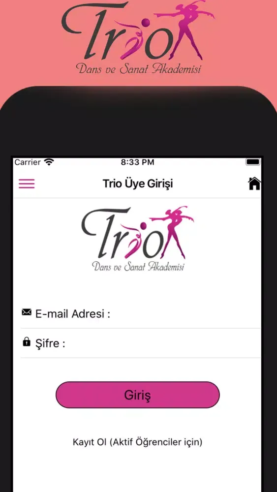 * Trio üyeleri uygulama içerisindeki tüm alana ulaşabilirler. Mevcut üye iseniz lütfen Trio Dans ve Sanat Akademisine vermiş olduğunuz bilgiler ile mevcut üye formunu tamamlayınız.