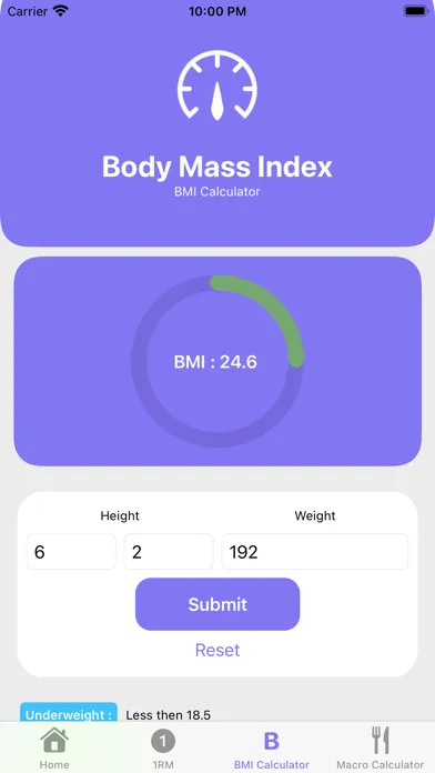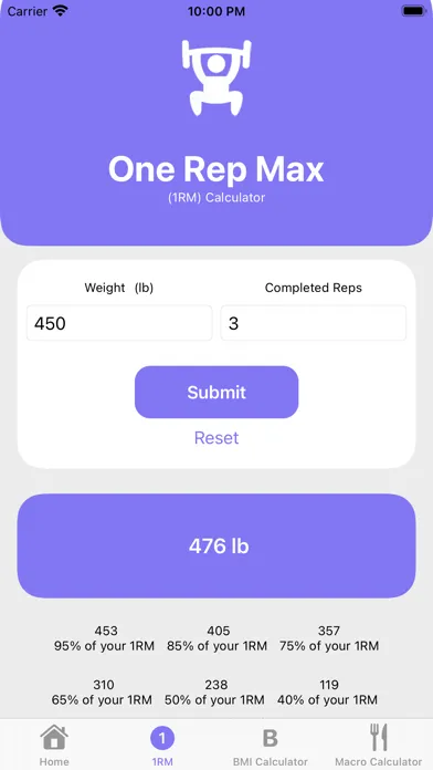 One Rep Max : How much ya bench? Ever been asked that question and were unsure what to respond with? Well, now you can! Using the Brzycki formula, we can calculate what your one rep max would be based on your input. Able to do 5 reps at 225lbs? Well, now you'll be able to know what you'd be able to max out at. This is also incredibly helpful when using percentages to plan your workout routine. We also show you what your various percentages would be of your one rep max!