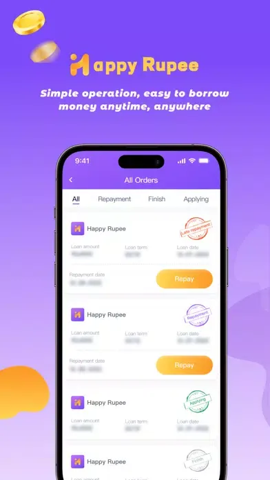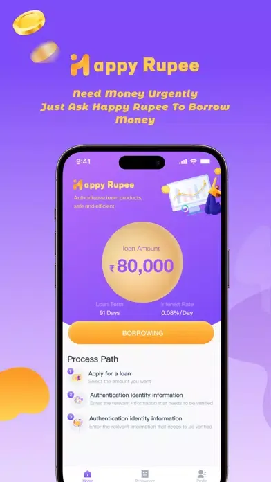 Happy Rupee is one of the online lending platforms in India. If you are over 18 years old, have a stable mobile phone number and a stable source of income, you can come to Happy Rupee to apply for a rupee loan. We'll increase the limit and loan term based on your credit score! The more data you provide, the higher your credit score will be. Loan steps: