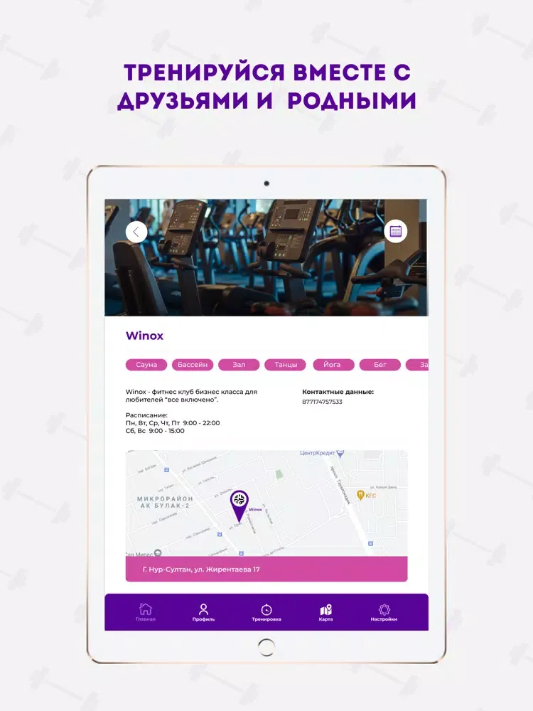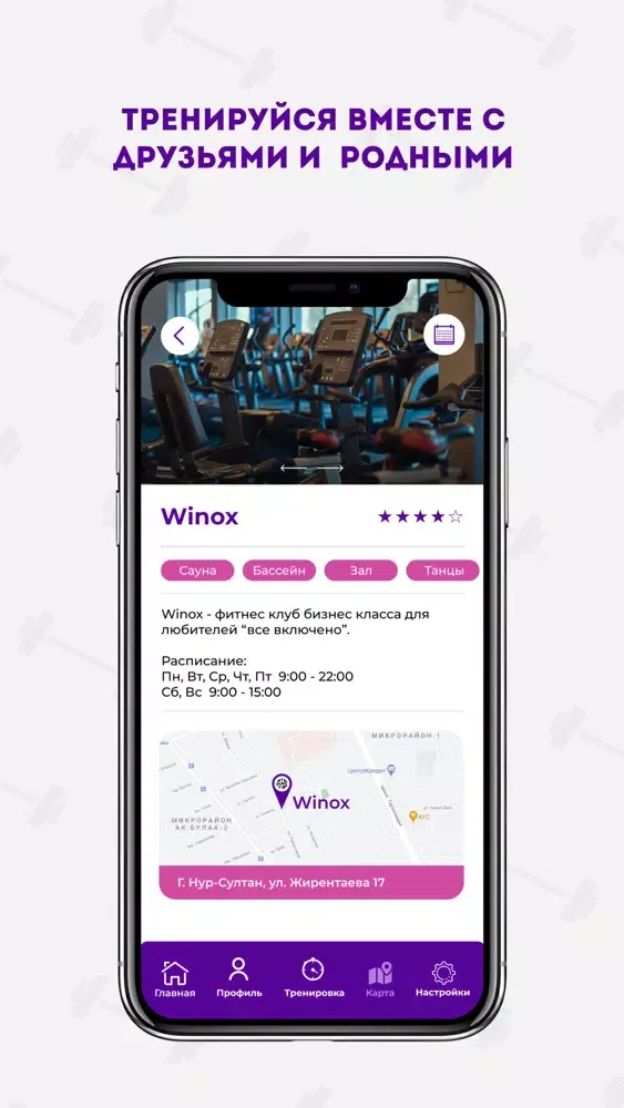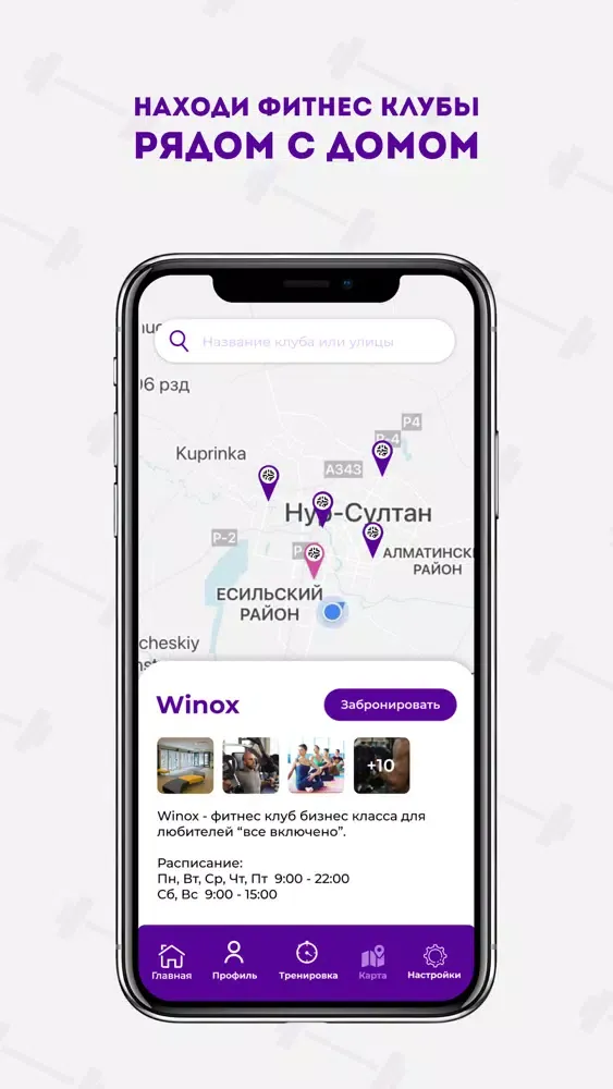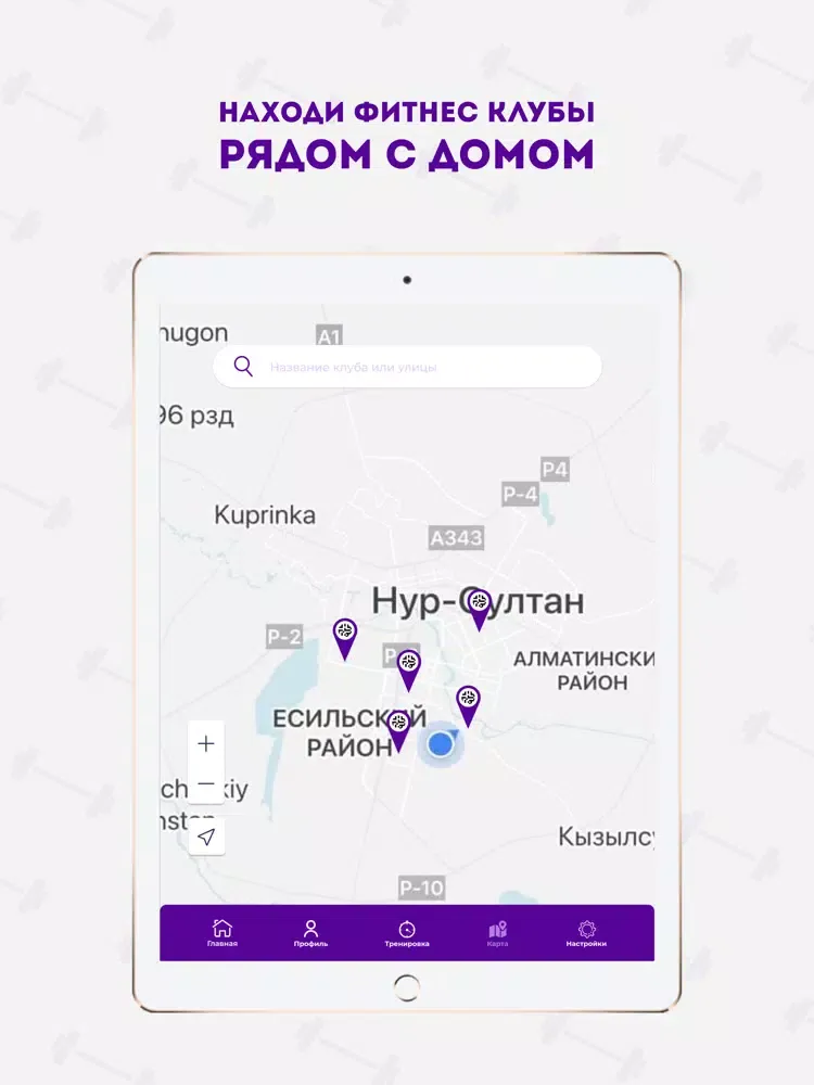 1) Выбирай подходящий фитнес-клуб на карте города или в главном экране
