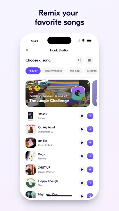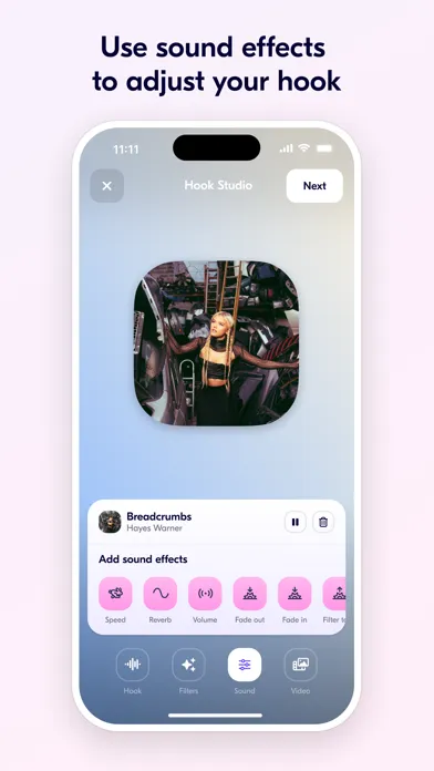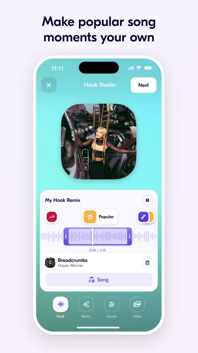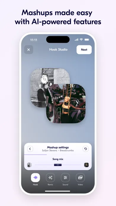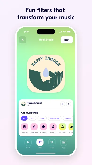 Hook empowers anyone to remix and mashup their favorite songs and share it on social media. Simply select a song from our catalog of licensed music and get creative with our music effects including genre based filters, mashups, sound effects and more.