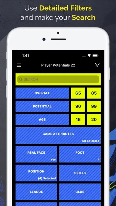 This is unofficial helper app for the 2025 football game. Player Potentials 25 application has any relation to EA Sports companies, EA FC 25 game or FIFA Organization. This app only provides FIFA 22, FIFA 23, EA FC 24 and EA FC 25 in-game footballer lists presented by its creators.