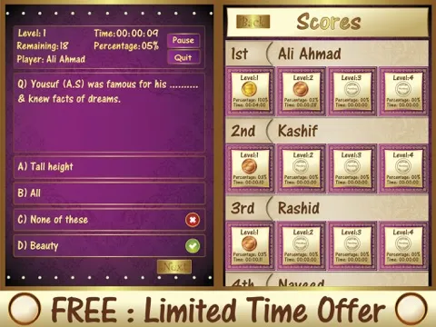 To keep it more interesting we also including a score board in the app. It will contain all the information of each user (Children) playing the app which help parents/Guardian to keep a track of their child learning. On the other hand it encourages the children to score more then the other users to get at the top position which ultimately lead to their more interest in ISLAM and they gain more knowledge.