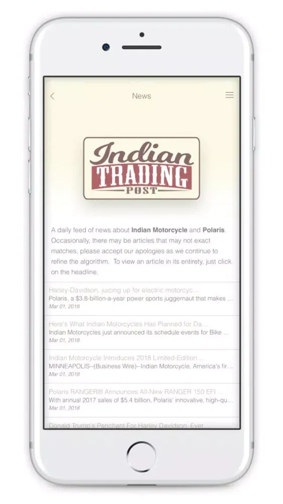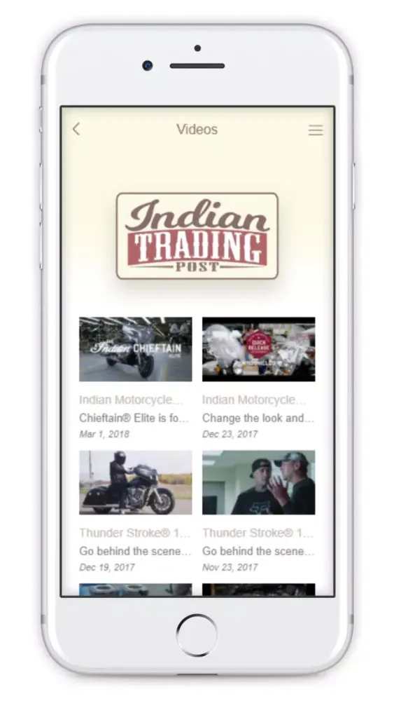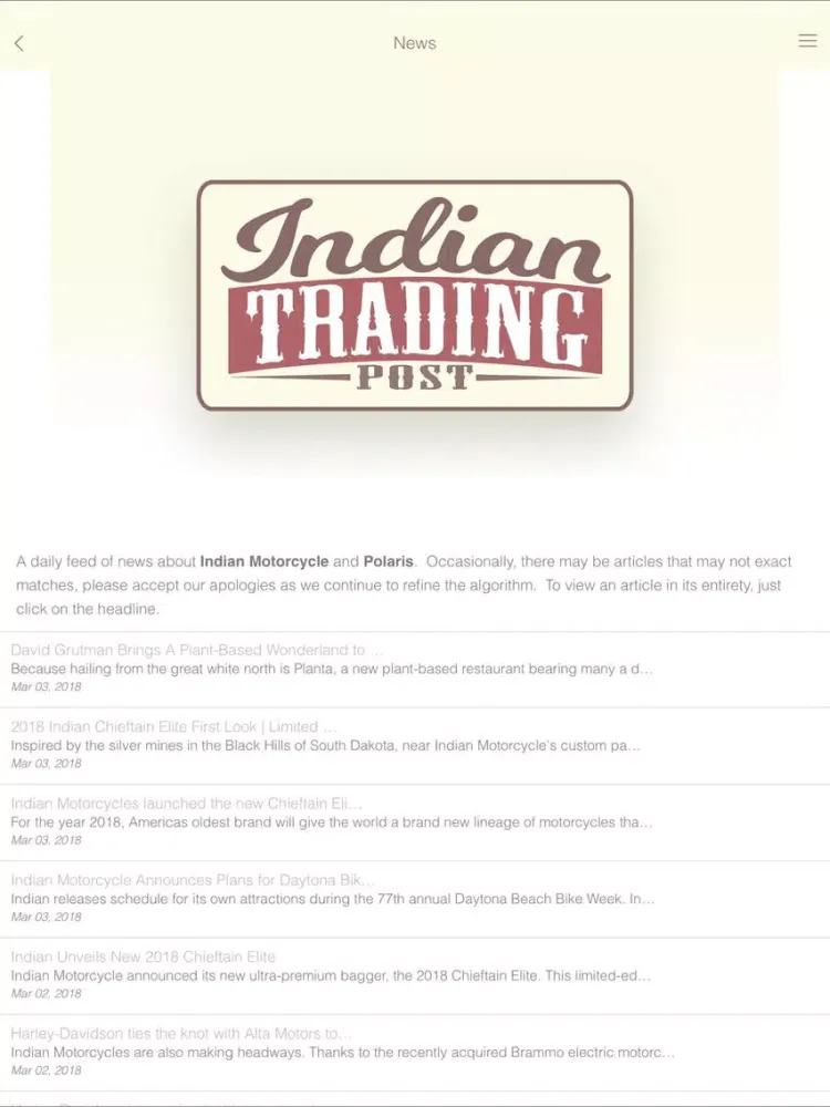 A community app for motorcycle enthusiasts, particularly Indian Motorcycle. App provides vendors and dealers of Indian Motorcycles. It does this through a social wall to allow members to share products and reviews.