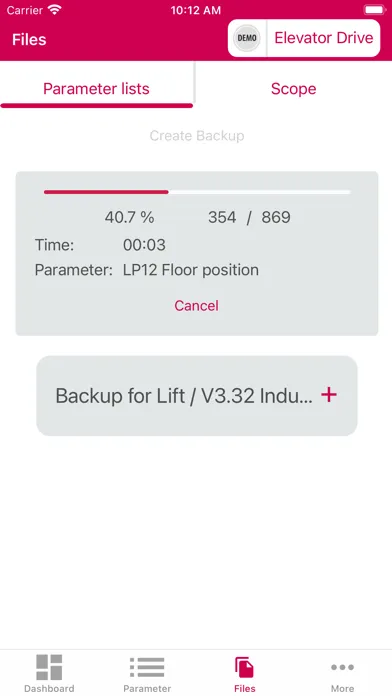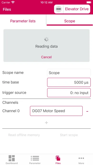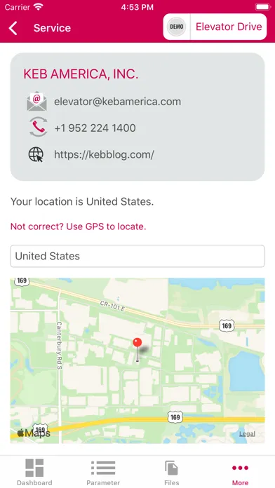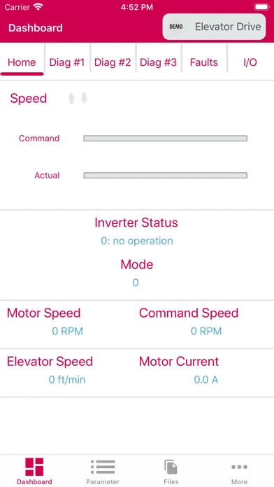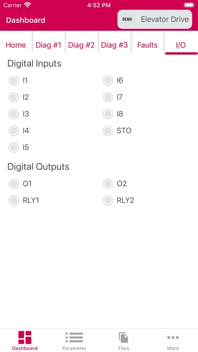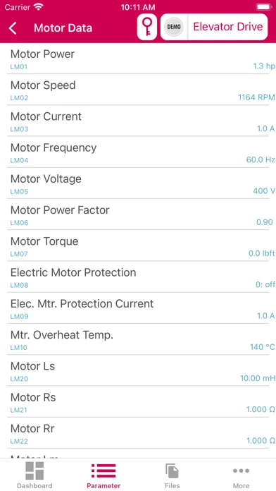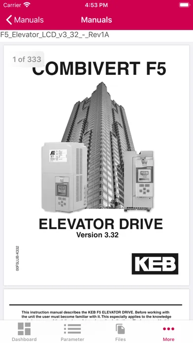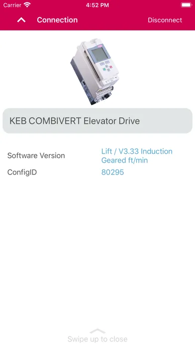 The KEB Elevator app is used to interface via Bluetooth to the F5 Elevator drive. The KEB Elevator app has the capability of viewing, editing parameters, creating backup parameter lists, and viewing KEB manuals. In addition, the KEB Elevator app can be used for diagnostics and troubleshooting, I/O status, and fault history. A suitable Bluetooth adaptor is required for a Bluetooth connection.
