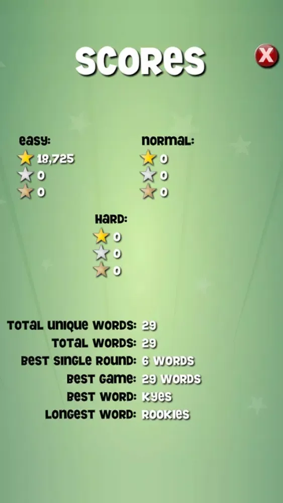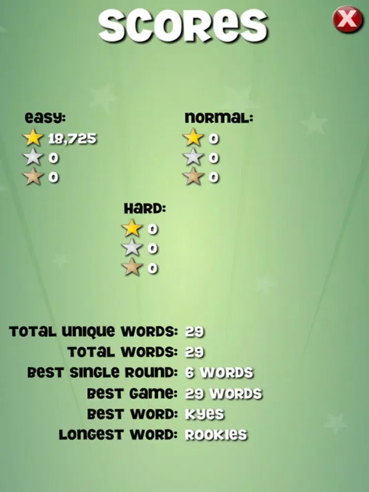 Stats will be saved during gameplay including: high scores, total words, best word, longest word, and more! You can also test your wordsmith abilities with the unique word count that keeps track of all unique words you have spelled throughout the game.