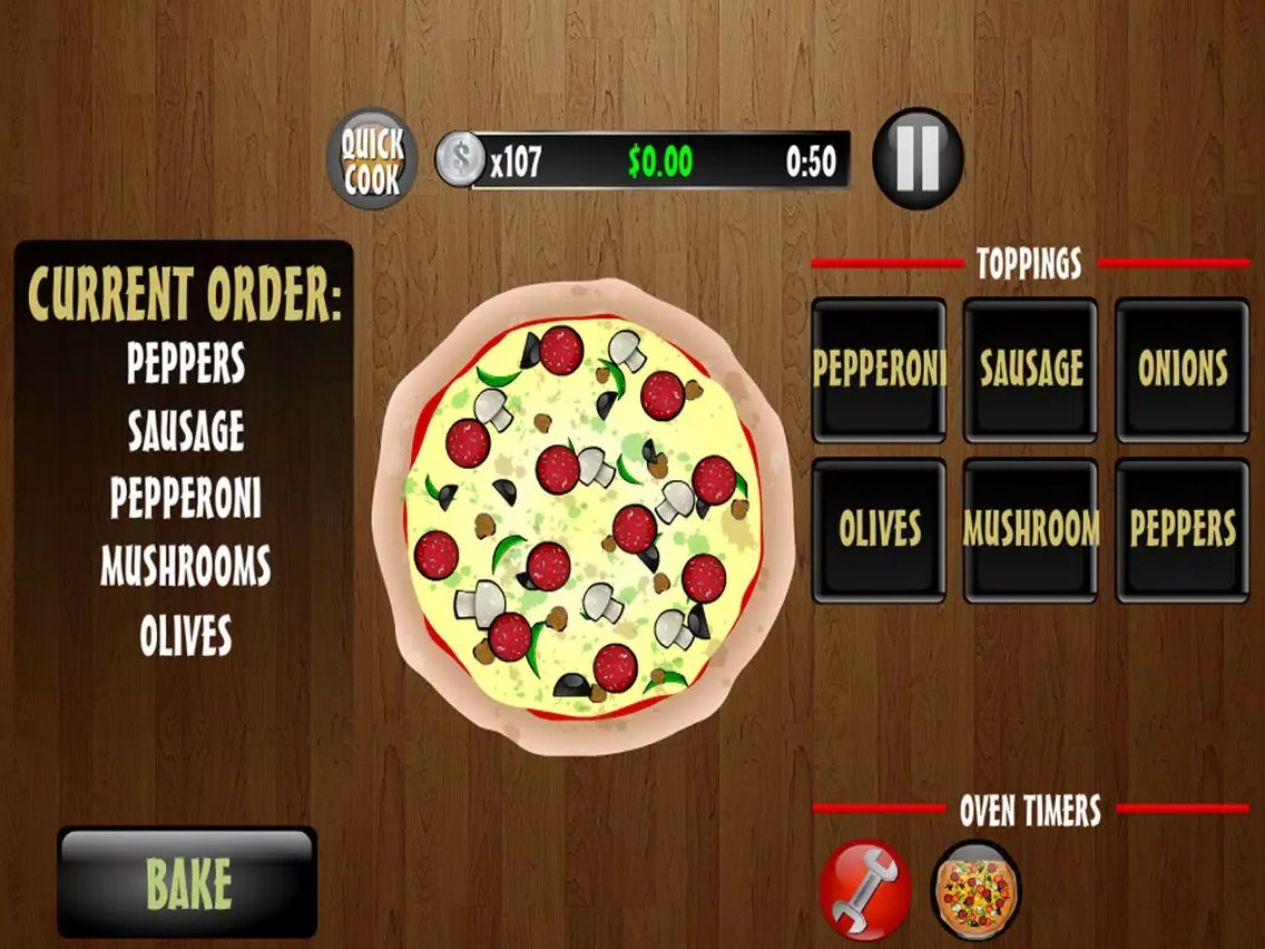 To start, SWIPE LEFT to add the sauce; SWIPE RIGHT to add the cheese. Once the prep work is done, tap a topping to add it to the pizza, tap again to remove it. Once an order is filled, its BAKING TIME! Watch your oven timers to serve a pie before it burns. Ovens also require routine tune ups! The more toppings and ovens you have, the crazier the game gets! Panic is sure to ensue as your eyes race across the board to catch everything before your business goes belly up! Can you stand the heat in this culinary chaos? Or will you fold under the pizza pressure?