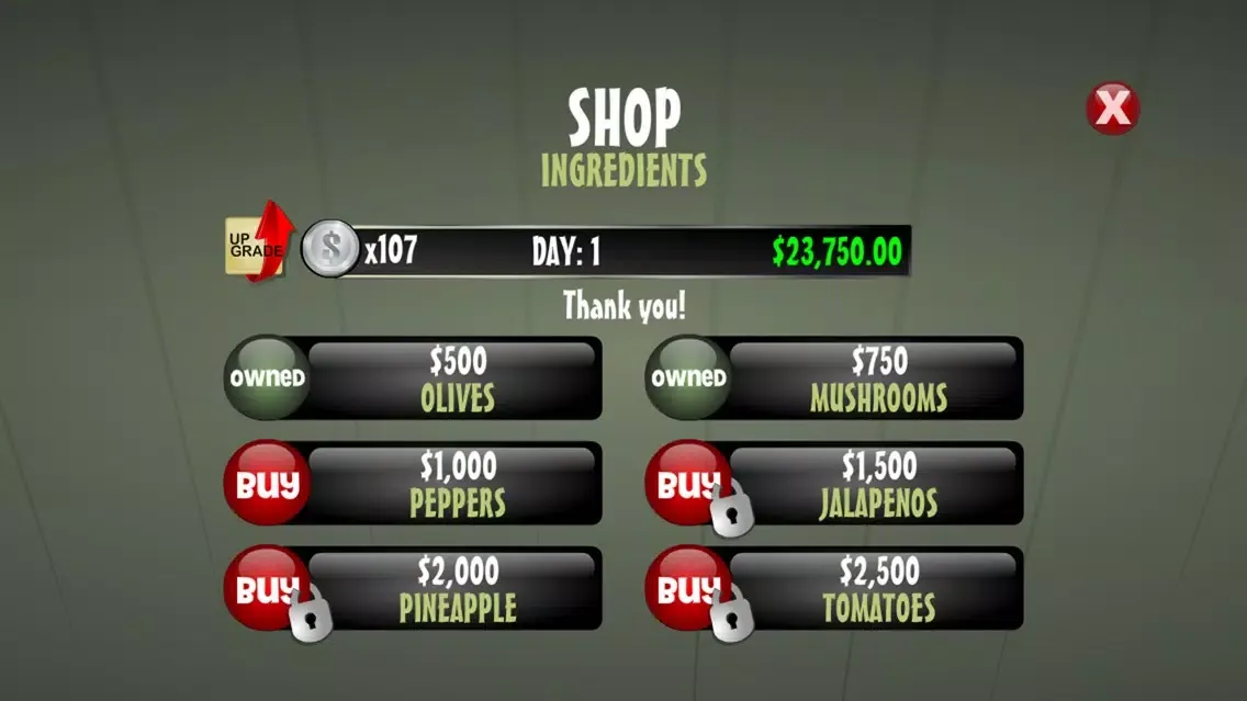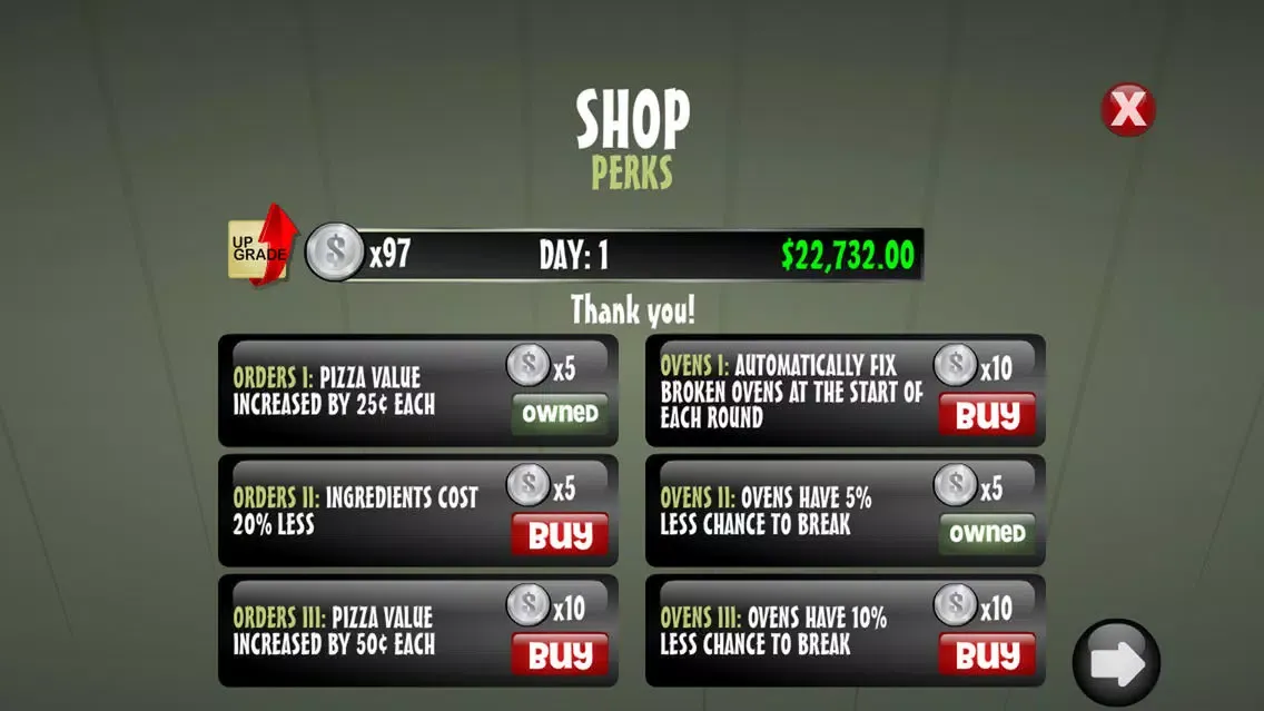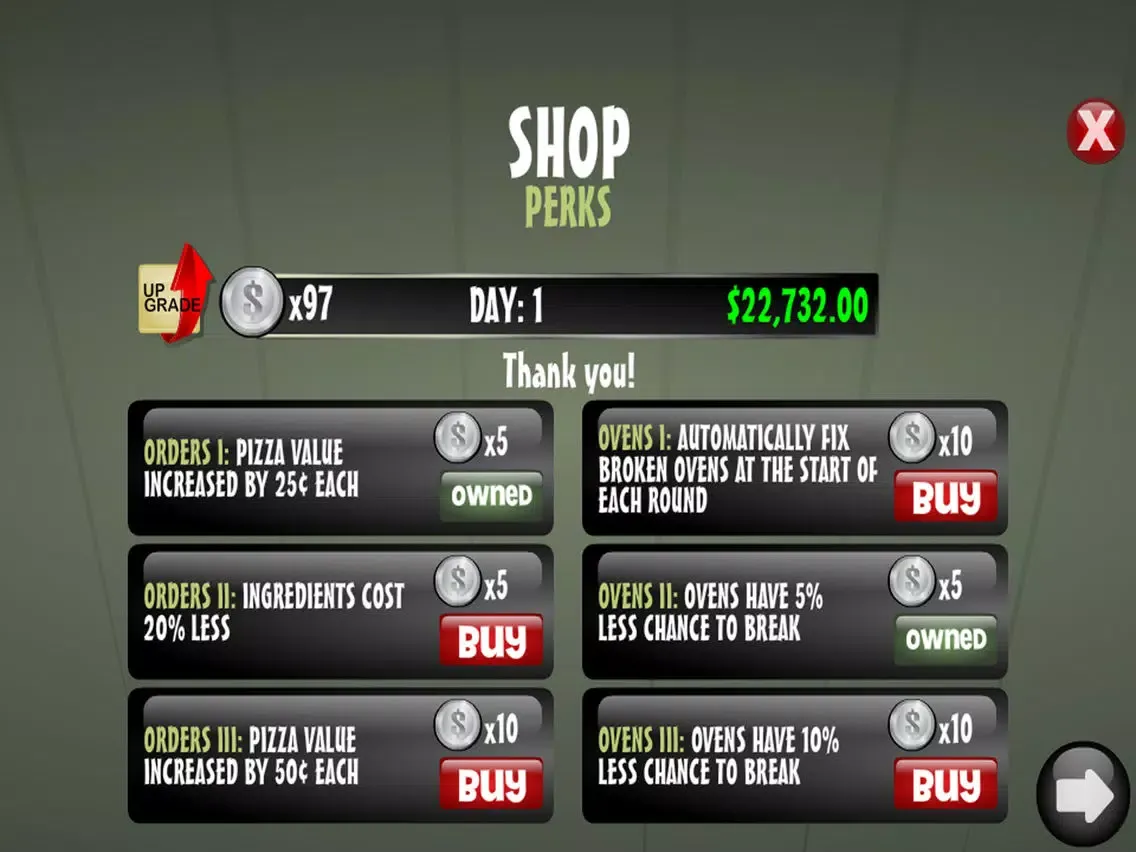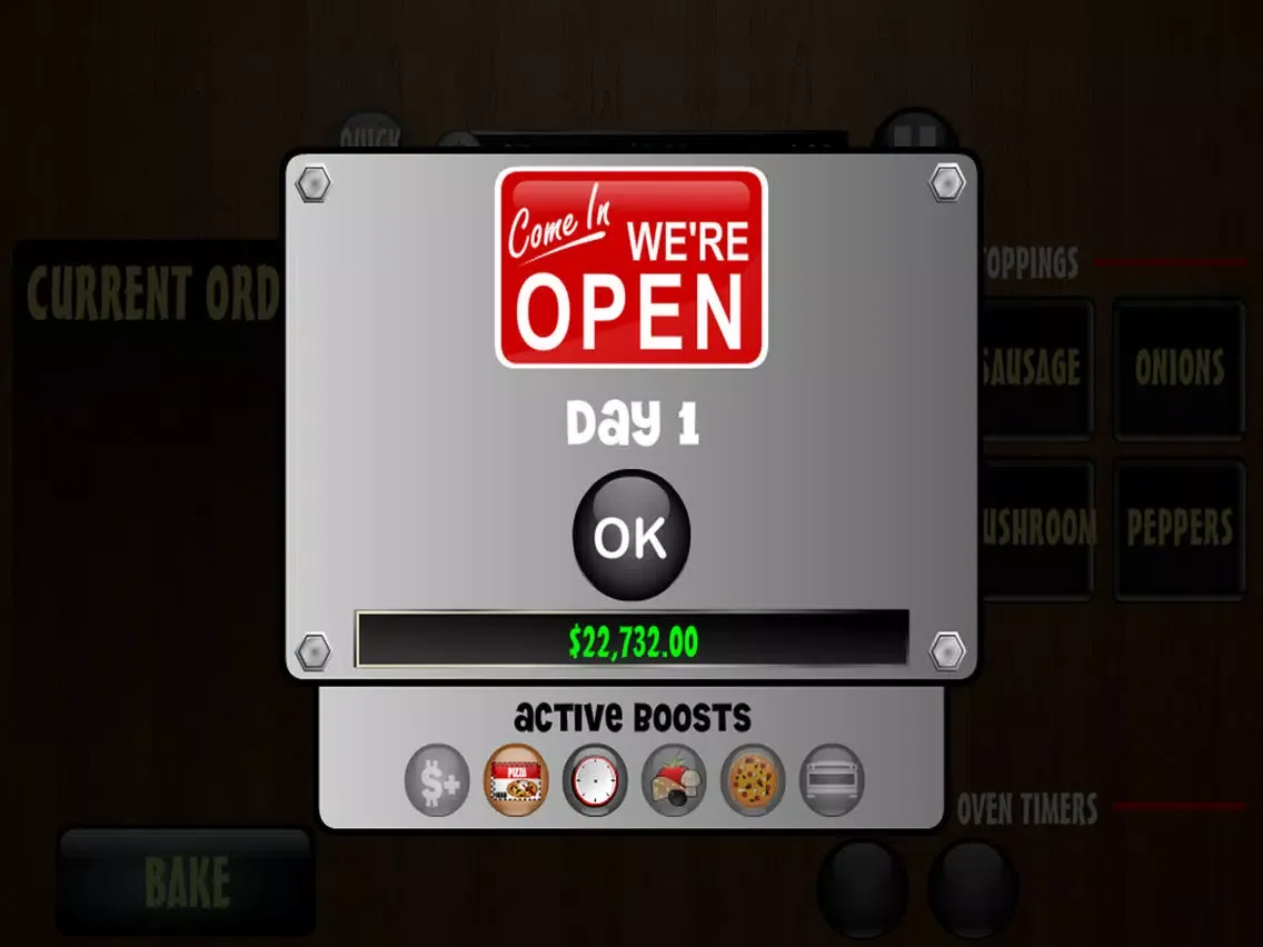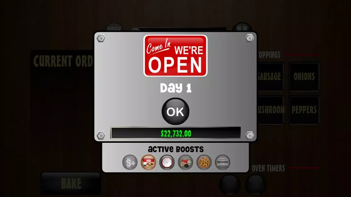 You can purchase up to 6 additional toppings and 2 extra ovens in the SHOP, all of which rake in some much needed dough (pun intended). Choose from 6 boosts ranging from increased tips, faster ovens, extra time on the daily clock, and more! The SHOP also comes equipped with a perk section to unlock additional game features and bonuses.