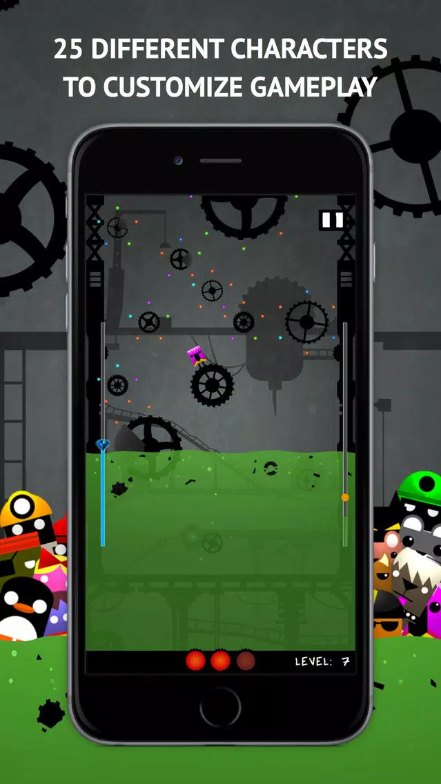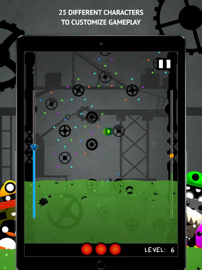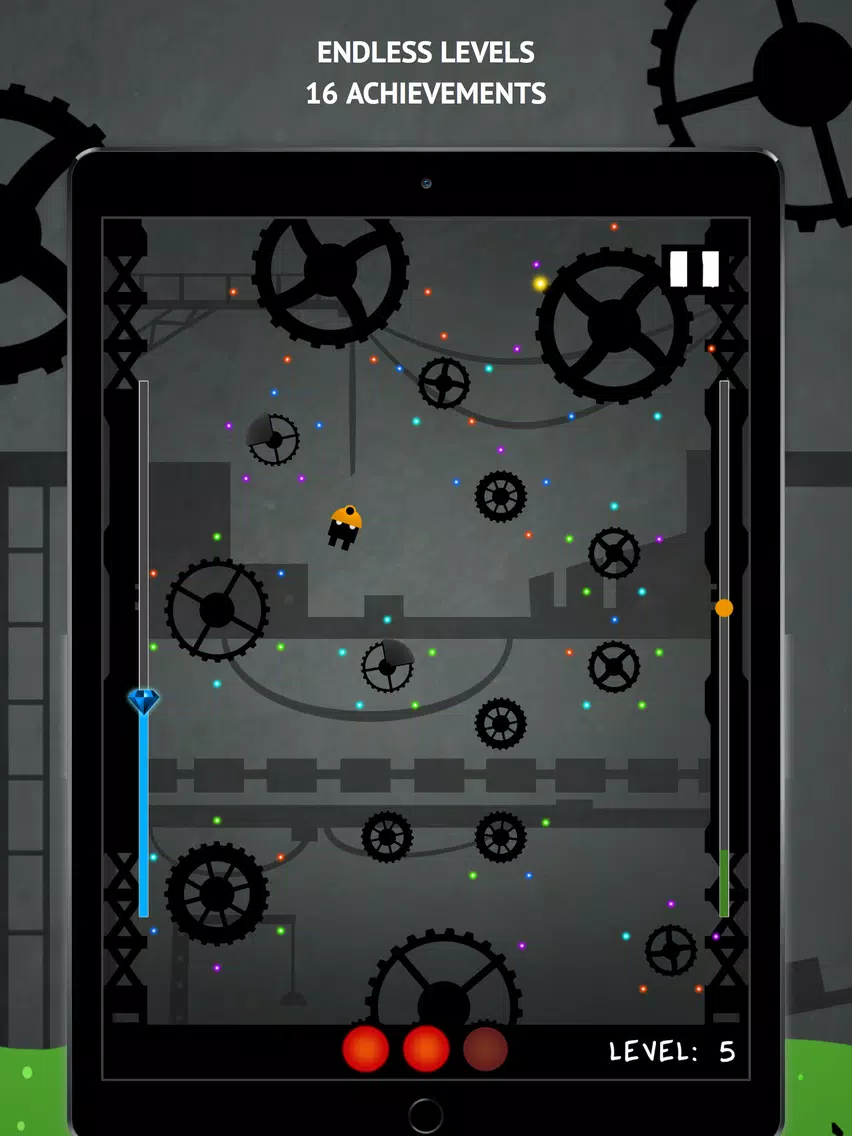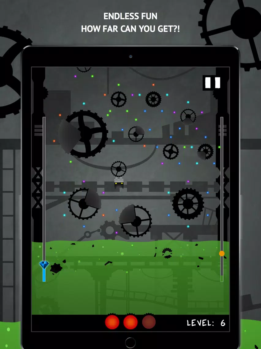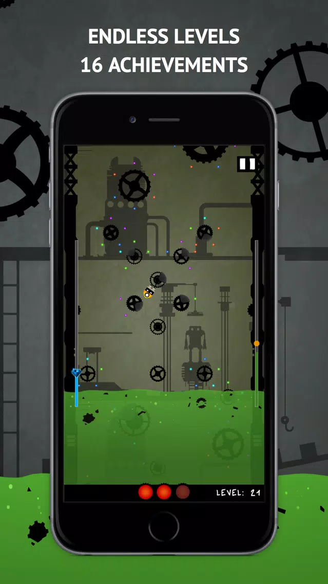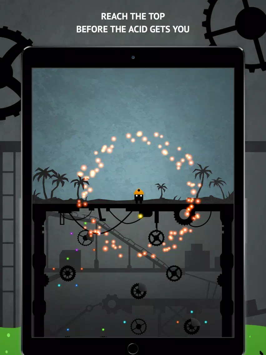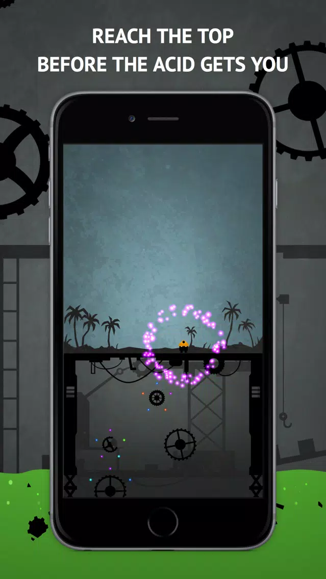 Tap the screen to jump from one gear to another, and collect orbs around them to build gems while not falling into the rising acid. You can temporarily stop the acid or turn off gravity by picking up the totally unsuspicious glowing yellow light floating around in each level. Try not to hit shielded areas on the gears or you'll get reflected back!